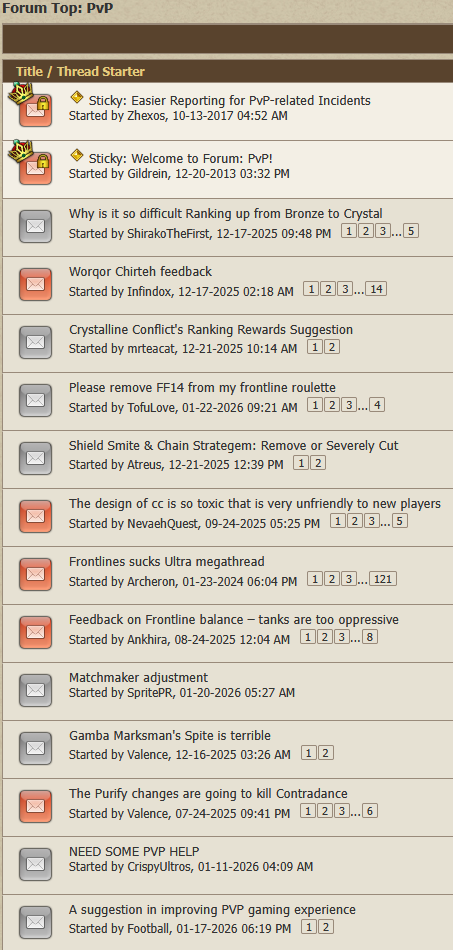 The real proof that PVP is shit in this game is not the forum complaints, but the fact that there are simply no guides or websites dedicated to it. Look at almost any other MMO or competitive game and you WILL find constantly-updating guides and help for learning fundamentals or playing specific classes.Meanwhile FFXIV has Icy-Veins, full of guides that were last updated in 2023, and shitty youtube videos from ESL avatarfags