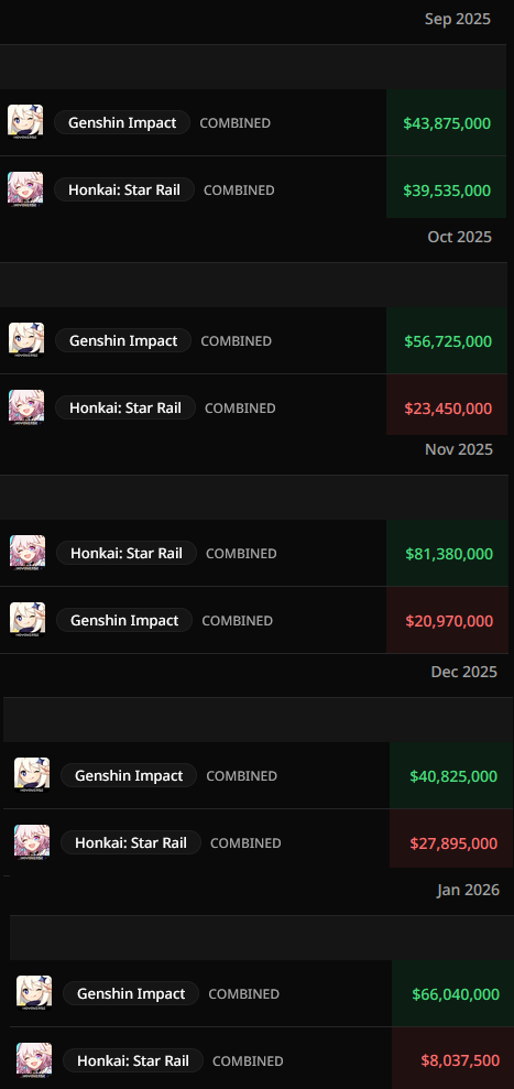>>556173808We already know the true total revenue of these gachas>Tencent officially released that WuWa made ~$570 from Jan to July 2025 which is about ~80m per month and extrapolating is ~960m in total year>Mihoyo paid ~$2.2m taxes in the past 5 years since genshin released and speculation is their total revenue was ~$25-26B>This most popular CN data analyst has been doing this for the past 5 years and these are his numbersgacha games yearly revenue for 2025>Genshin Impact $3.145B>Honkai Star Rail $2.339B>Zenless Zone Zero $1.223B>Wuthering Waves $965MAs you can see is that WuWa made the same as what Tencent released so he's very reliable and also total Mihoyo revenue is ~$6.5B which goes in line with their total revenue for the past 5 years.