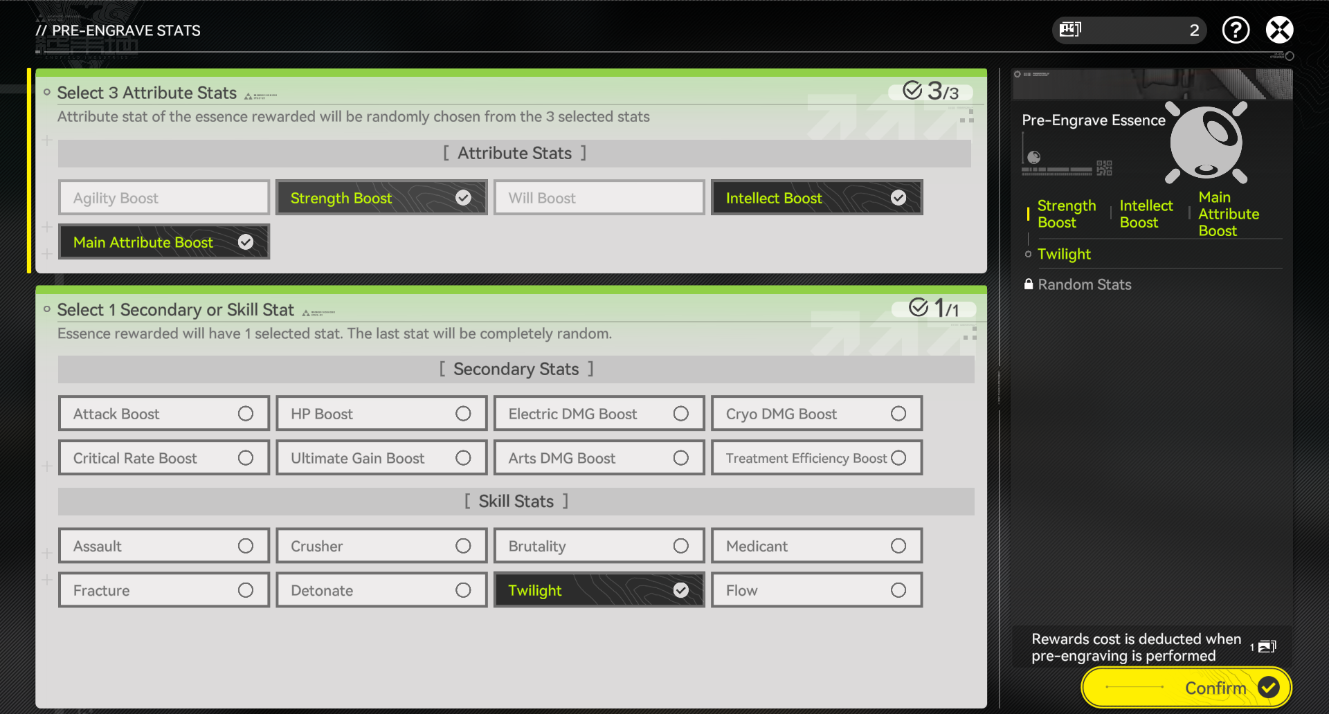 >>556188728Do you want to play it safe or try to go for higher ceiling?It is possible for Essence to not have any Skill, but it's impossible for it to have more than one Skill. If you want to play it safe then current one is correct, but for riskier, higher ceiling one you pick Atk Boost since it's more universal.