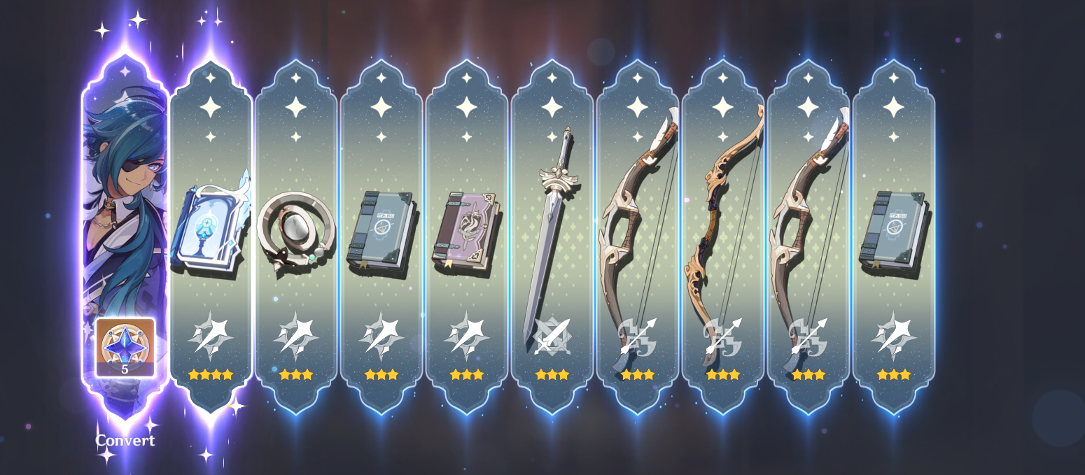 >20 pulls at 0 Pity on 50/50This patch has been very nice to me. Got Bina and Ineffa+Sig while running on primo fumes the whole time.Special thanks to the anon that wished me luck after I got Ineffa at 38 pity when I was down to just daily singles left. I currently have 10 pulls remaining.