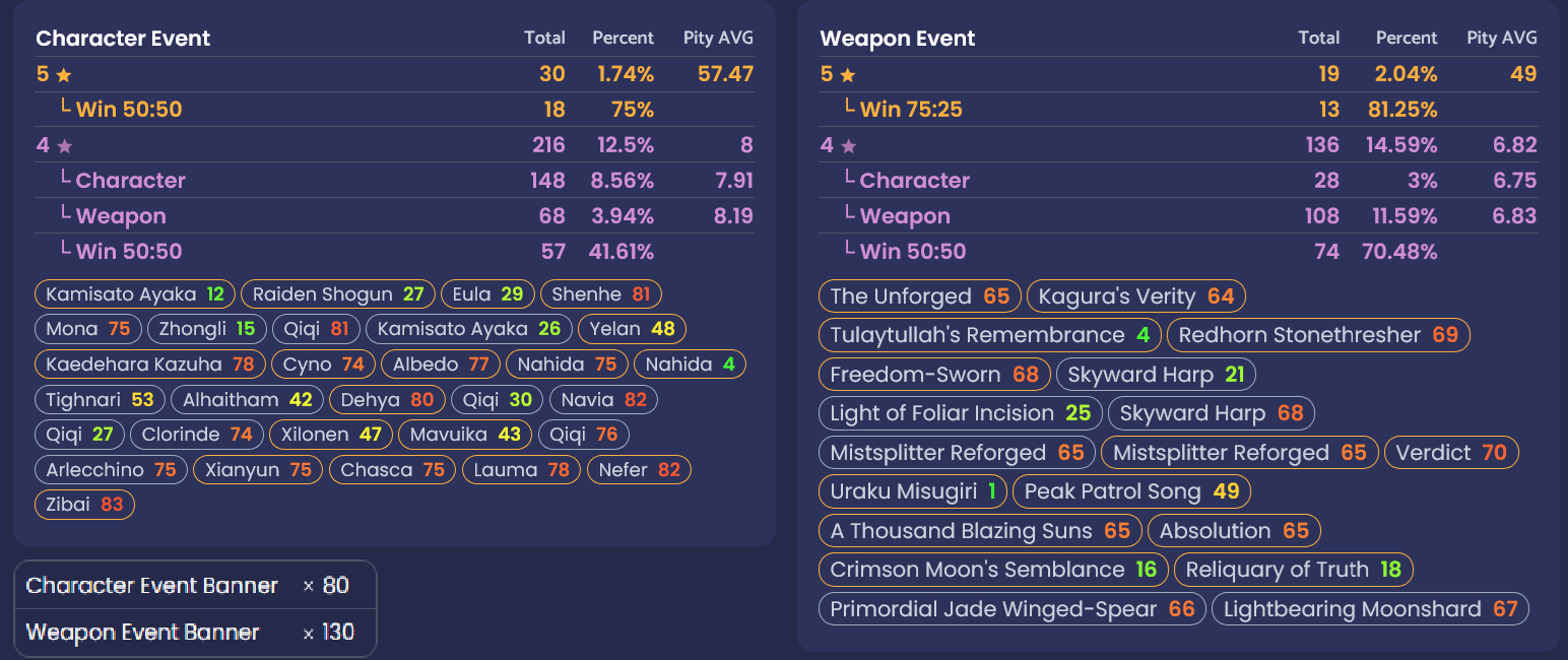 Less than 160 pullsLost 50/50 to Mona (c3)Barely got c2 IllugaGot c6 AinoGot c4 Gouro after being stuck at c0 for years.Got Zibai shifu and can use Xilonen or Chiori sig.