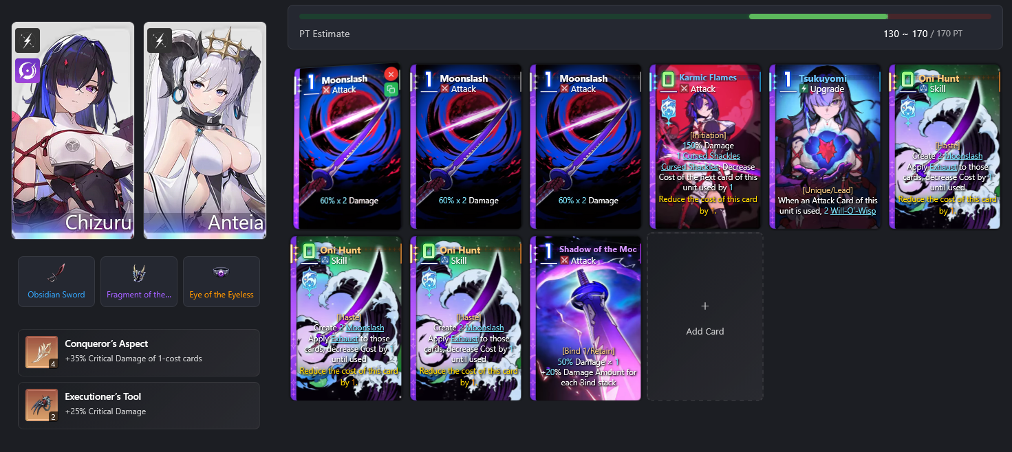 >>556191848i don't use a basic attack chizuru deck, i use a shadow of the moon deckfor this specific build, anteia is good because she gives the most dmg out of all partners
