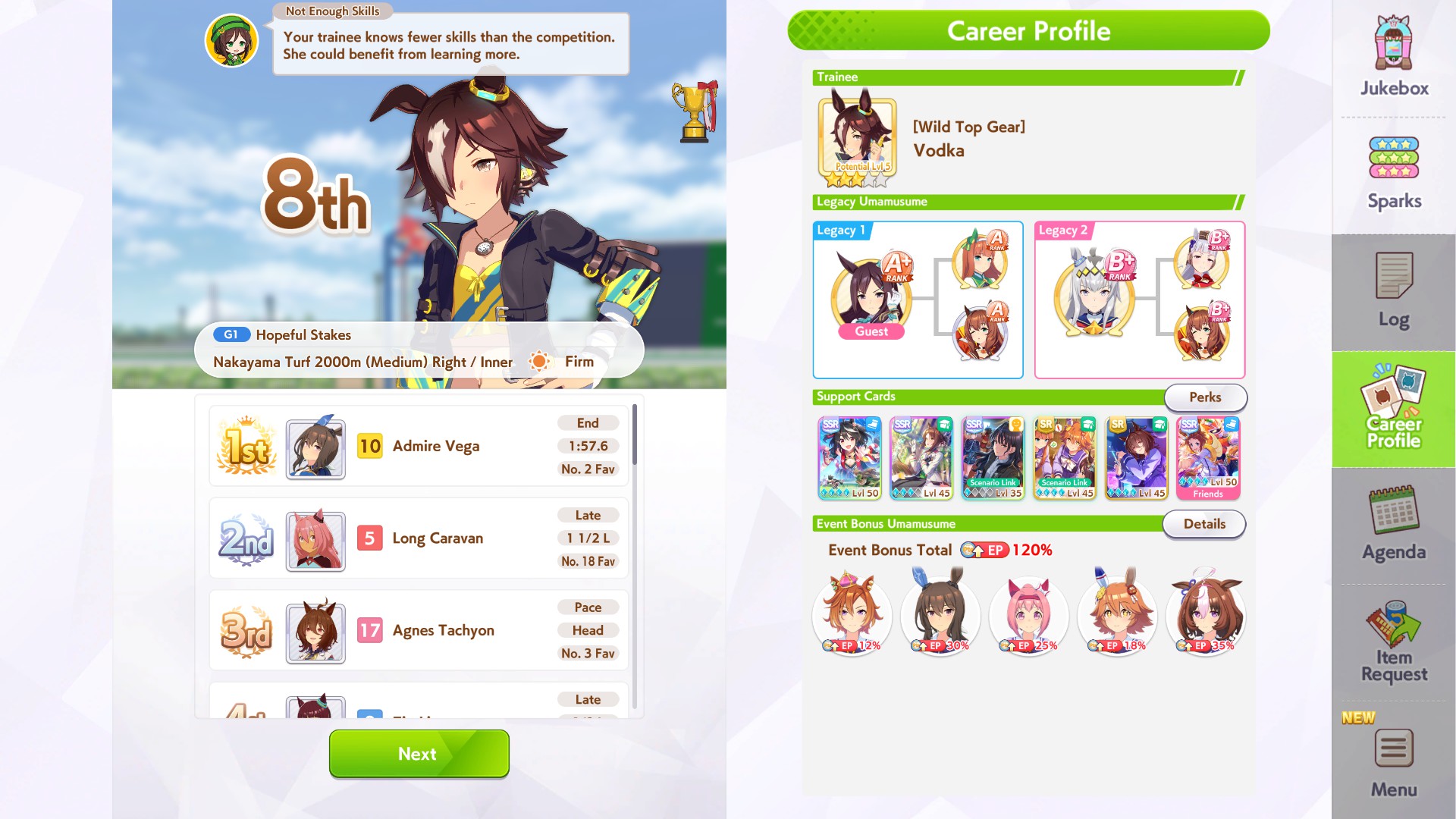Current Rate Up Support Cards: SSR Admire Vega (Power), SSR Matikanefukukitaru (Speed)