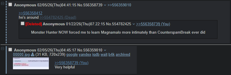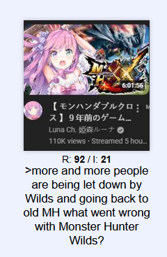 all huntress fags must hang>I have a question about Monster Hunter!https://pastebin.com/D3zuHuqK >MH Stories 3: Twisted ReflectionRELEASE DATE: MARCH 13, 2026Official Website: https://www.monsterhunter.com/stories3/en-us/Steam Store: https://store.steampowered.com/app/2852190/Monster_Hunter_Stories_3_Twisted_Reflection/Announcement Trailer: https://www.youtube.com/watch?v=XszCdDNI-lsIntroduction Video: https://www.youtube.com/watch?v=ps6yAI5THmMHabitat Restoration Trailer: https://www.youtube.com/watch?v=764b4_5dZJgGameplay Video: https://www.youtube.com/watch?v=6JDesEGUuO4 >MH WildsAT ARKVELD: FEBRUARY 18, 2026Wilds Info: https://www.monsterhunter.com/wilds/en-us/Steam Page: https://store.steampowered.com/app/2246340/Monster_Hunter_Wilds/Event Quest Schedule: https://info.monsterhunter.com/wilds/event-quest/en-us/scheduleTU4 Trailer: https://www.youtube.com/watch?v=Aijx69md9pUTU4 Changes: https://info.monsterhunter.com/wilds/update/en-us/Ver.1.040.00.00.html/mhg/ Persistent Lobby Info: https://i.imgur.com/M7MmPid.jpeg >MH WorldWorld on Steam Store: https://store.steampowered.com/app/582010/Monster_Hunter_World/Iceborne on Steam Store: https://store.steampowered.com/app/1118010/Monster_Hunter_World_Iceborne/General Info: https://pastebin.com/PKeD8Smg >MH RiseRise on Steam Store: https://store.steampowered.com/app/1446780/MONSTER_HUNTER_RISE/ Sunbreak on Steam Store: https://store.steampowered.com/app/1880360/Monster_Hunter_Rise_Sunbreak/General Info: https://pastebin.com/rewGysVq >Older Game Emulation and Multiplayer/Frontierhttps://pastebin.com/fYyeU0kY >Databaseshttps://kiranico.com/ >Where does /vg/ play?/mhg/ has its own squad in Wilds: RL9XQ7VMPost the game, platform, room code, and password (7243/rage) >/mhg/ OP Template (use this when making new threads)https://pastebin.com/K3FHwGpr Previous thread: >>556023918