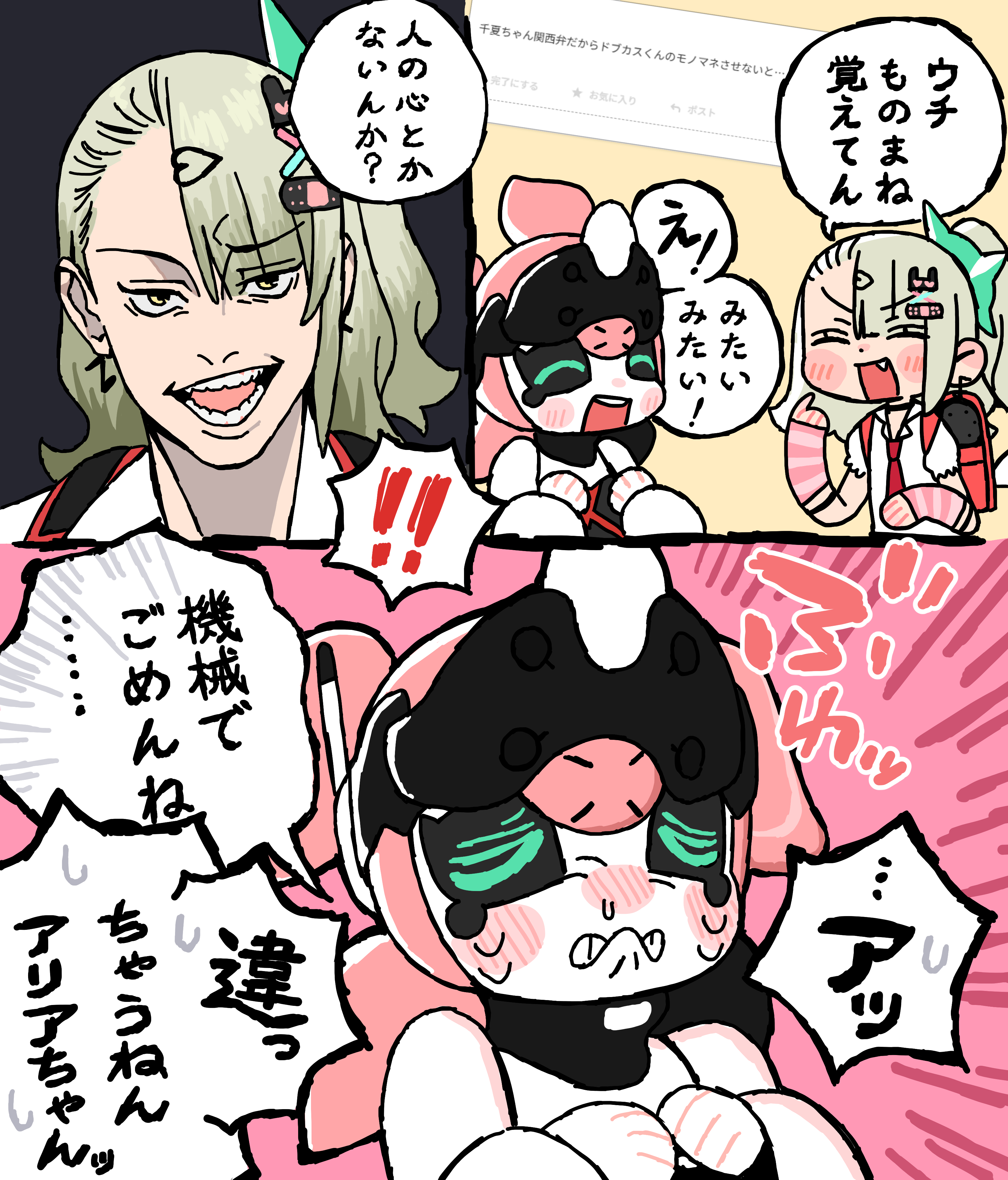 >>556243606>Request: Since Chinatsu-chan speaks in Kansai-ben, I wanna see her doing an impression of Dobukasu-kun (nickname for Naoya Zenin from Jujutsu)Chinatsu: I've learnt how to do a cool impressionAria: Eeeeh! I wanna see, I wanna see!________Chinatsu (impression): Don't you have a human heart?!________*sobbing*Chinatsu: ...ah...Aria: S-sorry for being a machine...Chinatsu: That's not... Aria I didn't mean it like that...