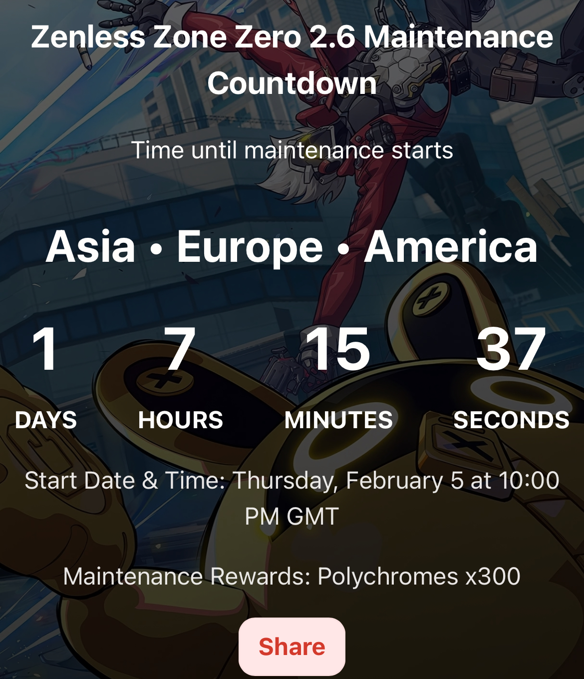 Previous: >>556231658 >NewsVersion 2.6 "Encore for an Old Dream" Special Programhttps://youtu.be/oTRy9pZ4TYEAgent Record | Ariahttps://www.hoyolab.com/article/43039871Agent Record | Sunnahttps://www.hoyolab.com/article/43037944 >Newest Trailer/Teaser/Character demohttps://youtu.be/06G8YgOrXTw (EN)https://youtu.be/FJ0HD6RC6PY (JP)https://youtu.be/HLv8Dz8t6Hkhttps://youtu.be/7wMz8mDyHgM (EN)https://youtu.be/triNgwM3bGI (JP)https://youtu.be/35fRoOYhE6Y (EN)https://youtu.be/BSKG5nhlj5s (JP) >Upcoming Events for 2.5https://zenless.hoyoverse.com/en-us/news/161728All-New Program 12/29 - 02/05Special Visitor 12/29 - 02/09Potential Hypothesis New Chapter Reforged 12/29 - 02/09Sword Seeker Chronicles 12/31 - 02/05Joint Investigation: The Divine Maze 01/03 - 01/22Shadow Riptide Clash 01/09 - 01/26Wish Filing Station 01/14 - 02/02Advanced Bounty: Area Patrol 01/16 - 01/21"En-Nah" Into Your Lap 01/21 - 02/05Angels and Delusions of Muse 01/21 - 02/05Data Bounty: Combat Simulation 01/30 - 02/04Angels of Delusion Training in Progress 01/30 - 02/09 >Redeemable codes (claimable in-game or online)https://zenless.hoyoverse.com/redemptionZENLESSGIFTZZZ25MINAZHAOISFREE ShunguangWinterGiftZZZ20265OZ2HDP95IZZZANGELSZZZ26DELUSIONAODDEBUT >Resources and useful linkshttps://rentry.org/zzzlinkshttps://rentry.org/ZZZ-Friendshttps://rentry.org/ZZZ-Guilds >/zzz/ OP pastebin (use this if making new thread):https://pastebin.com/PzbMf13P