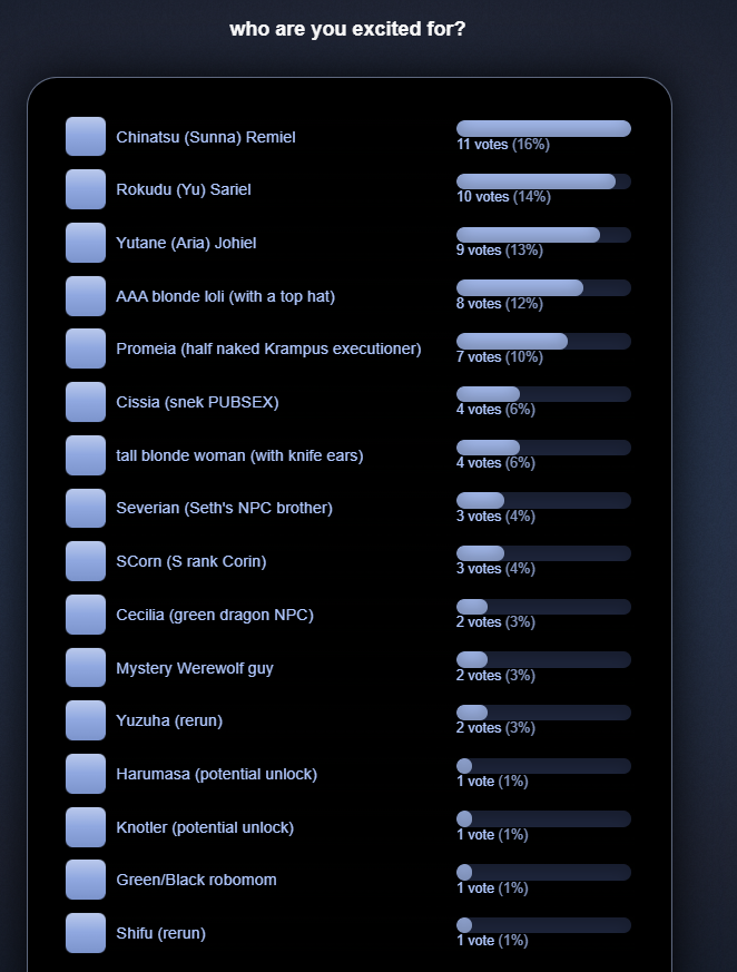>purple hair girli'm 50/50, her covered look I need to see in game. her slutty outfit looks pretty bad. pony tail is a little eh >seths brotherboring but I like it better than the other male S ranks>nep tail girllove it, hope she has a good kit