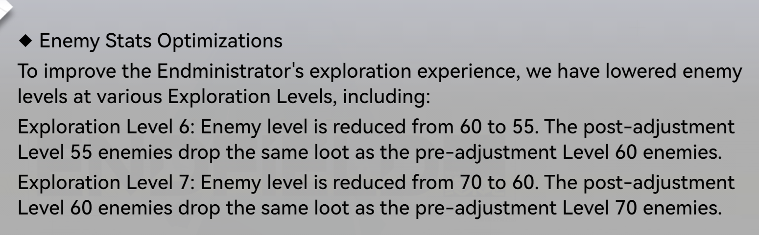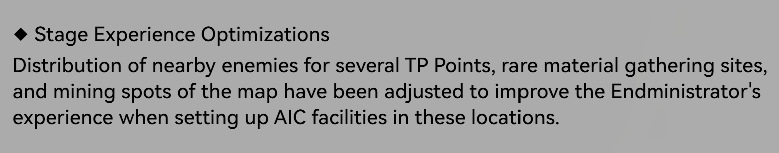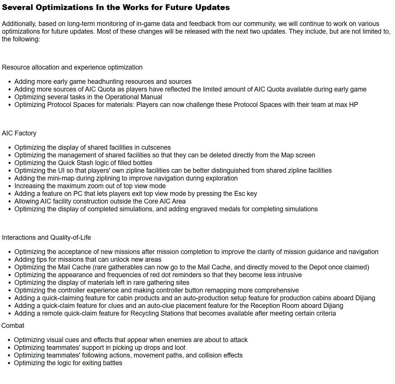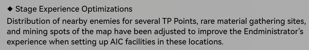 Full Summary of Future Upcoming Changes:- More early-game headhunting resources and acquisition sources.- Additional AIC quota sources to address early-game shortages.- Streamlined tasks in the Operational Manual.- Protocol Spaces for materials can now be challenged with full HP teams.AIC Factory Enhancements:- Improved display of shared facilities in cutscenes.- Ability to delete shared facilities directly from the map.- Improved Quick Stash logic for filled bottles.- Clearer UI distinction between player-owned and shared ziplines.- Mini-map added during ziplining for better navigation.- Increased maximum zoom-out in top view mode.- PC players can exit top view mode with Esc.- Allow AIC construction outside the Core AIC Area.- Improved simulation completion display and engraved medals for simulations.QOL Changes List:- Smoother mission acceptance flow after completing missions.- Added tips for missions that unlock new areas.Mail Cache improvements:- Rare gatherables can go directly to Mail CacheItems move straight to the Depot when claimed- Reduced visual clutter from red dot notifications.- Improved visibility of remaining materials in rare gathering sites.Expanded controller support and remapping options.Added quick-claim and automation features:- Production cabins (Dijiang)- Reception Room clues (Dijiang)- Recycling Stations (remote quick-claim after criteria met)- Clearer enemy attack visual cues and telegraphs.Improved teammate behavior:- Better loot pickup- Improved following and movement- Reduced collision issues- Refined battle exit logic for smoother combat transitions.- Early-game difficulty reduced without harming progression.- Faster gearing and smoother onboarding for new players.- Major AIC usability improvements for factory management.- Continued focus on QoL, clarity, and polish across exploration, combat, and UI.