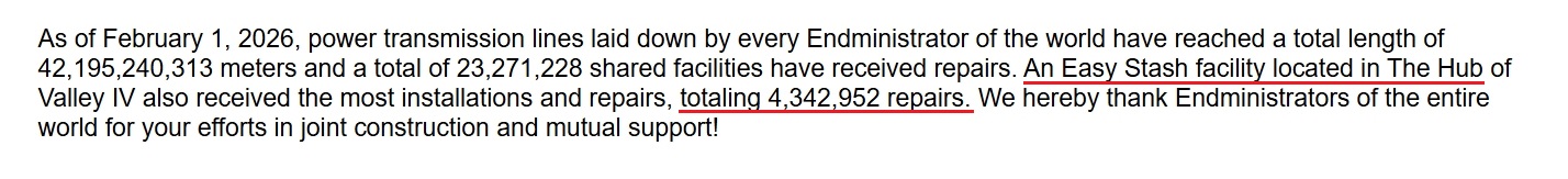 Previous thread: >>556242276NEWShttps://endfield.gryphline.com/en-us/news/3846>Official Websitehttps://endfield.gryphline.com/en-us>Official EN X (NEWS HERE)https://x.com/AKEndfield>Chartered Headhunting ScheduleJanuary 21st to February 7th --- "Scars of the Forge", (Laevatain)February 7th to February 24th --- "The Floaty Messenger", (Gilberta)February 24th to March 13th --- "Hues of Passion", (Yvonne)>Reward CodesENDFIELDGIFTENDFIELD4PC>Twitch Dropshttps://endfield.gryphline.com/special/third-party-binding?channel=twitch>Voyage to the Stars (Ongoing until March 4th)https://endfield.gryphline.com/activity/voyage-to-the-stars/en-us/>Special Launch Streamhttps://www.youtube.com/watch?v=dz2g_D52NR0>Official Release Trailerhttps://www.youtube.com/watch?v=oJ00ggFb8A0>Official Release PV'shttps://www.youtube.com/watch?v=5Xm45NwWOlohttps://www.youtube.com/watch?v=UPpeeft1-8ohttps://www.youtube.com/watch?v=tN80M6IEMo0>Wikishttps://wiki.skport.com/endfield (Official)https://perlica.moehttps://warfarin.wiki/enhttps://endfield.wiki.gg/>Blueprint Guideshttps://talospioneers.com/en>Stickershttps://drive.google.com/drive/folders/13KH3L6QPIKkVH7pBddv4uxwmwJsnOtklhttps://drive.google.com/drive/folders/1OuVtjv1k-9c3M6n7d4PX3CGG5bkwH04ahttps://drive.google.com/drive/folders/1AStB8bzFk3lSwMwczWPkFYCBrZe0vHOghttps://drive.google.com/drive/folders/1yS0lqUhxf8tBRtpDFfCU1y16IS2sSeF7>Fr/end/sSubmit your info, /end/min:https://forms.gle/Fo7BhZMKaKqiWyL19View other /end/mins:https://docs.google.com/spreadsheets/d/1YtxiDss0hgEQhLlZgpfzyGrJrzUcqDzOS9T6IH-BiVc/edit?usp=sharing