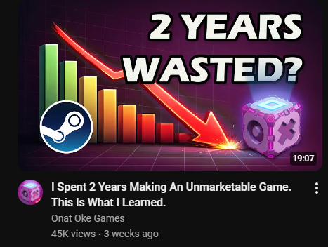 >>556356825>>556360764I could see myself spending about 18h yeah, I don't know why the game is in Early Access still, seems more than feature complete to me and overall the project reeks of insecurity. The game is massively overpriced, the early version of Minecraft cost 10€ and this costs 14,79€. You can tell a lot about how well something does based on how it's priced, this is something I would expect to find on a shareware website for free in 2007, something like Algodoo with an optional premium version.If you want to sell a product you also need to treat it like a product meaning you need a Good Idea, Intuitive Gameplay, Good UX, Art that sells the game, Good gameplay loop. So far it's only average in some of these and has almost catastrophic failure in the UX and Art department, not because it's all terrible but because it's inconsistently terrible. A more reasonable price point for this game would be 4,99€, 9,99€ if it had appealing art and soundtrack. A good example reference point is https://store.steampowered.com/app/3133060/Gnomes/ that has simple but very readable art that fits the aesthetic.