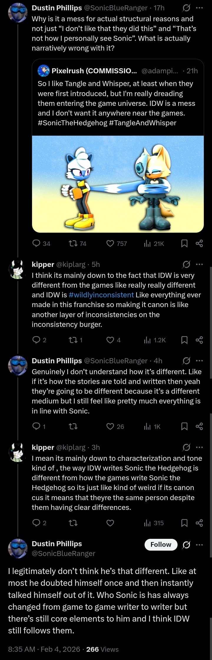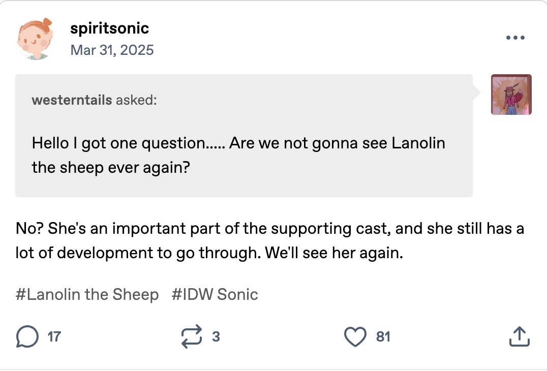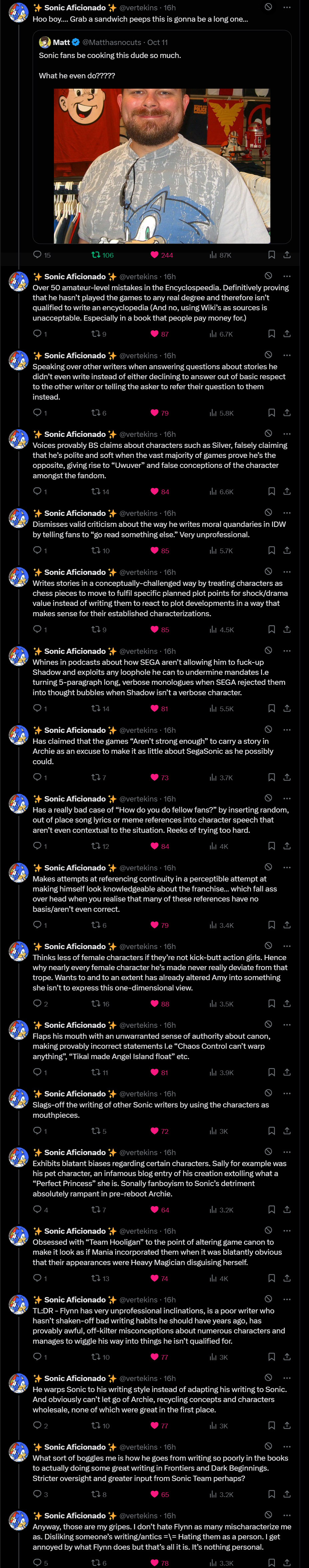 >>556284839>The obsession with East West shit is just so dumbMost people understand that Sonic has some level of consistency but it isnt something clearly defined by an East vs West dichotomy and that both "sides" make mistakes all the time.The lore in this series is not that serious. That does NOT mean it doesn't matter. But it's not that deep.Labeling everyone that understands this as a "westfag" or "Richmunk" is extremely bad faith and is always when I just discredit the anon in question that does that.Now, all of that being said, they should probably consider contracting out to someone other than Ian. His best years of doing this are clearly behind him, and he was never all that great to begin with.