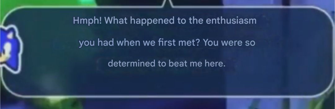 >>556285646>being hopeless about Sonic's return means he can't help OmegaWhat is this stupid logic? >>556285797He was saying "I won't give up" within the context of fighting Eggman in SA2. That doesn't mean he can't ever become hopeless. He says in JP "I'm not gonna run away [from Eggman]".