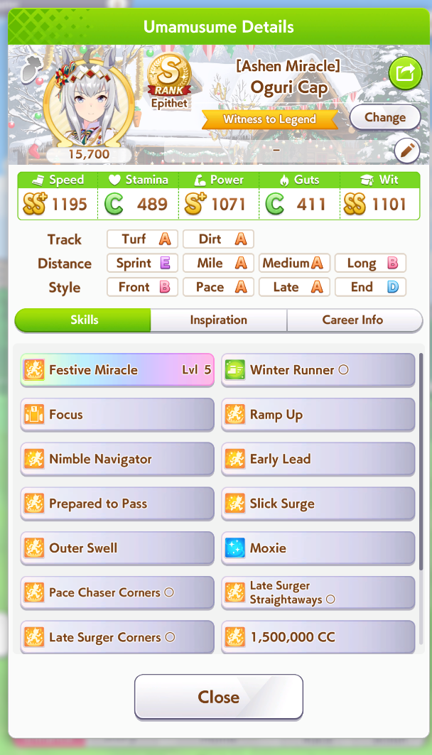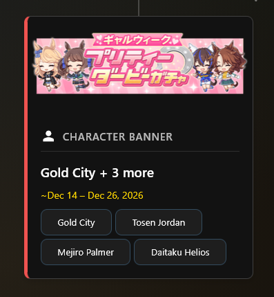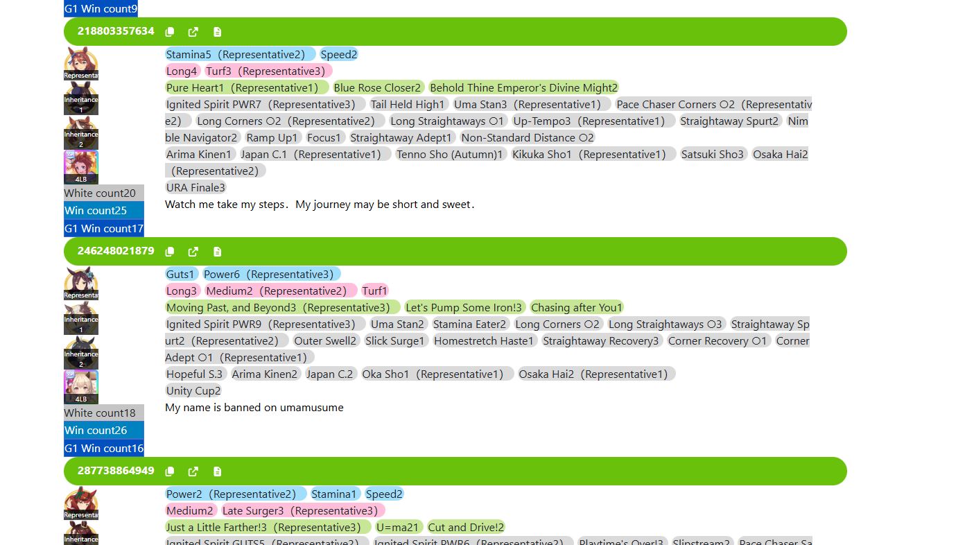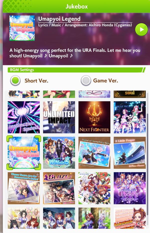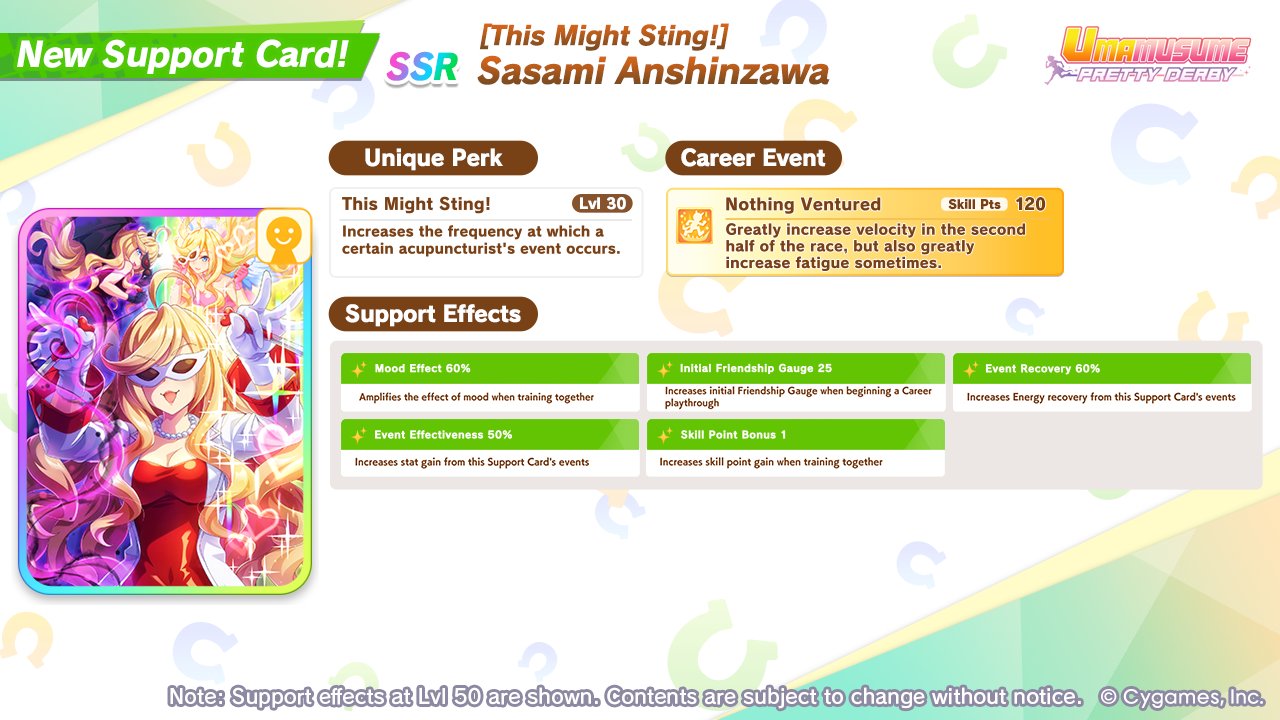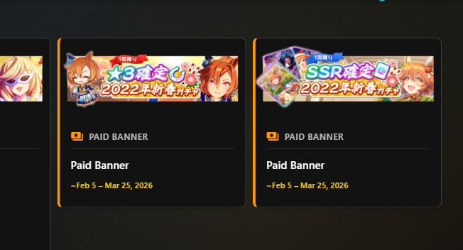Previous: >>556256269 >Global Game NewsLink your account to Cygames iDCurrent Scenario: Aoharu Hai aka "Unity Cup"Current Rate Up Trainee: New Year T.M. Opera O (3*), New Year Haru Urara (3*)Current Rate Up Support Cards: SSR Admire Vega (Power), SSR Matikanefukukitaru (Speed)Current CM: Capricorn Cup - Chukyo Turf 1200mMain Story Chapter 5 is out01/27 - New Beginnings Part 101/29 - NY Opera & Haru 3*+Fuku SSR+Ayabe SSR02/05 - 02/12 Racing CarnivalMid February - Capricorn Cup - Chukyo Turf 1200mhttps://umamusume.com/news/100040/https://pages.snep.pw/uma/anni-skill-changes/>JP Game NewsCurrent Rate Up: Valentine Taiki Shuttle (3*), Valentine Sounds of Earth (3*), SSR Matikanefukukitaru, SSR Neo UniverseNew Scenario "Yukoma Hot Spring" releasedTimeline: https://uma.moe/timelineCygames Webstore: https://webstore.cygames.com/en/umamusume_en/>Thread Clubshttps://rentry.co/umaglobalclublistYou must be E3 (20k points) to join a circle. Apply with /uma/ or /vg/ in your profile or post ID in the thread.>All Guides & Resourceshttps://rentry.org/uma26Game databasehttps://gametora.com/umamusume (Click the gear to switch between JP / global server info)A basic guide for newfagshttps://rentry.org/umaglobalFind networks if your region is blocked from the game or clienthttps://www.umavpn.top/93Seiyuu & Concertshttps://rentry.org/umstUma Texthttps://umareader.idsmile.xyz/