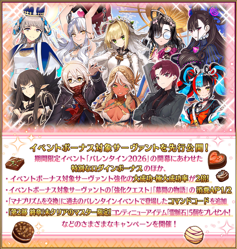 they haven't actually announced the valentine's event. there is no bonus servants list, or event preview of any kind. last year nasu only said they were going to release the servant's scenes, but he also was very careful and said "i don't know what form the valentine's event will have."