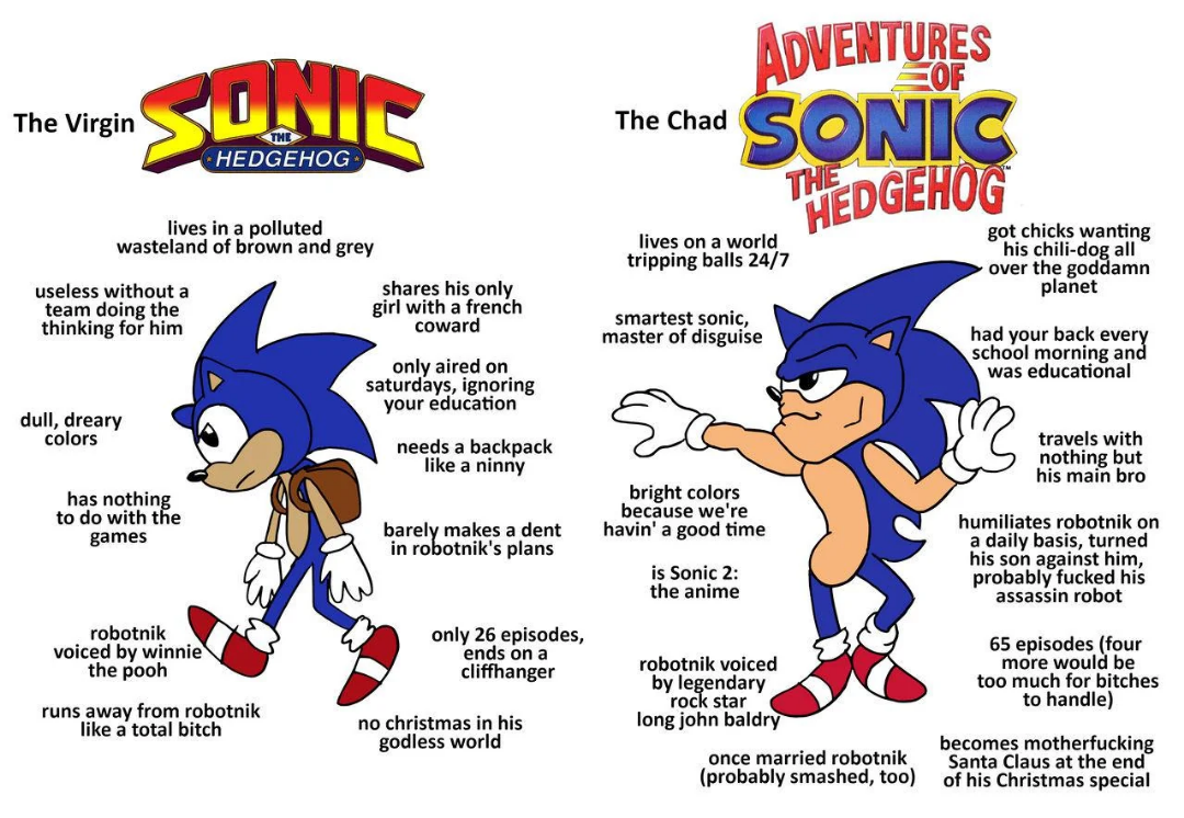 >>556293669>OVA Sonic isn't afraid of watereh>OVA Sonic doesn't have shitty romance dramaEHHH>OVA Sonic isn't pining for a girlfriend.that's true>OVA Sonic isn't trying to redeem Eggmanthat's true but if he wanted to that wouldn't be a huge issue either>OVA Sonic isn't lusting after womenthat's true>OVA Sonic isn't motivated by being a herothat's true>OVA Sonic doesn't get corrupted into a "dark" transformationthat's true>OVA Sonic isn't a handsy idiot who accidentally shattered the worldHe literally almost does>OVA Sonic is decentYes