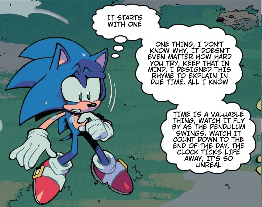 Body horror comic where a destroyed Metal Sonic fixes himself up with random badnik scraps until he becomes an unrecognizable mess and therefore can’t even see himself as Sonic anymore