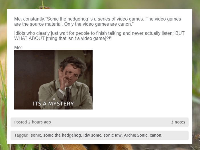 The problem with lorefags is they want a story-focused aproach to the ip but then they don't want the fundamentals of the characters to ever change.Good stories go through arcs.For some reason Tails and Shadow are the only ones that are allowed to evolve as people but if Sonc made friends with a new female character and over time started casually dating her they'd flip out and say SONIC WOULDN'T DO THAT. It doesn't have to be a dating thing but you get my point.As far as the OC's go, I generally agree with the negative sentiment, but part of the reason there are so many new OCs now is because everybody is so scared to do ANYTHING with the older cast because if Sonic so much as gets too angry at someone who hurts a friend of his or whatever people riot in the streets.You can't have it both ways.