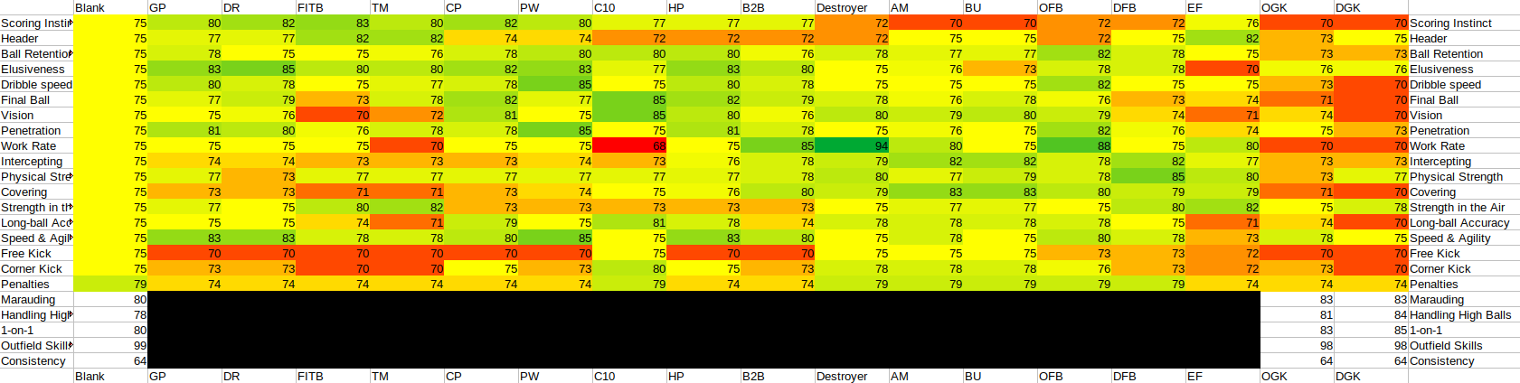 >>556311398No, but if you want to consider that then you need to account for destroyer (+work rate), offensive FB (+work rate), C10 (-work rate), and weighted pass (+long ball accuracy) all changing combined ability scores even if all stats are set to the same value. I'll see what the combined ability scores for all playstyles look like with these rules though