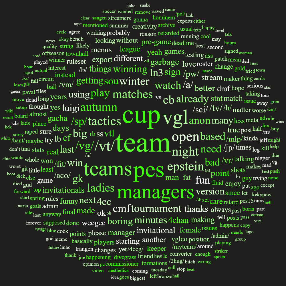 Previous: >>556002178>What... is this?Put simply, a simulation of Pro Evolution Soccer being competed between teams which are embodiments of boards of the 4chan imageboard. The players represent facets of each board's culture. All of the matches are AI versus AI. However, humans "manage" each team, creating their tactics and giving input during games as they happen to make substitutions and tactical changes as they see fit.https://implyingrigged.info/wiki/FAQ>Where can I watch the cup?https://isthisliv.com/4cc/stream.html>Ongoing Cuphttps://implyingrigged.info/wiki/2026_4chan_Winter_Cup>Upcoming Invitationalshttps://implyingrigged.info/wiki/LAN_Party_the_3rd:_Admins_of_the_Frozen_Thronehttps://implyingrigged.info/wiki/VGL_Luigi_Circuit_4https://implyingrigged.info/wiki/VGL_Ladies_Night_3:_The_Squidstein_Fileshttps://implyingrigged.info/wiki/Test_Cup_V_18.1https://implyingrigged.info/wiki/2026_4CC_Champions_Leaguehttps://implyingrigged.info/wiki//ag/_League_9/11:_Never_Forget>Wiki:https://implyingrigged.info/wiki/Main_Page>Sekkrit Code37pebis>DLC Passworddivegrass>Booruhttps://isthisliv.com/booru/>Archivehttps://implying.fun/>Other videoshttps://implyingrigged.info/wiki/Videos>PES Infohttps://implyingrigged.info/wiki/Pro_Evolution_Soccer_2015https://implyingrigged.info/wiki/Pro_Evolution_Soccer_2021>Previouslygarbage dayLN3"flawless" transition to PES21shitposting