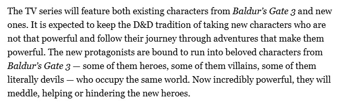 BG3 should have had an animated show not a gay ass live action show directed by a hack, they're not even going to hire larian writers for feedback despite bg3 having an award winning writing, this is why there will never be a bg4, larian doesn't own its own game, do you have any idea how lame they will make cazador or raphael sound without their voice actors? Literally no one can play astarino aside of neil