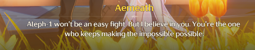 >Aemeath: I need to sacrifice myself. It's the only way because I care about you rover I need to help you>Rover: stupid. I will save you because I like to help people and my friends are important to me >*song starts playing*>Repeat the above like 5 times>Abby once a patch: I'm also here