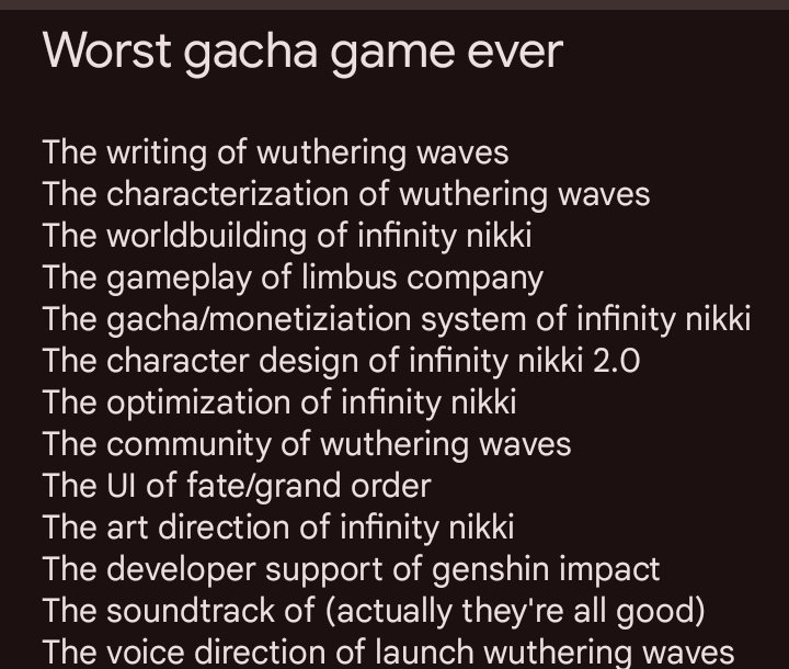 WuWa's """""""""""""""""""""story"""""""""""""""""""""""" and sorry excuses for characters have been since release:>go to new place>meet new female character>"OH MY GOD IS THAT ROVER-SAMA THE GOD EMPEROR CREATOR PUSSY WOMBSLAYER EARLY BITCOIN ADOPTER CHADGOD OF DESTRUCTION THE FIRST RESONATOR, THE FIRST INSTANCE, LORD ARBITER, ASTRAL MODULATOR, CHIEF STEWARD, FOUNDER AND LEADER OF THE BLACK SHORES, SAVIOR OF JINZHOU, STAR, DREAMWALKER, GUIDE OF CIVILIZATIONS, SEED OF FATE, MASTER, RIGHTEOUS ONE, FATED ONE, SAVIOR OF THE MONTELLIS, CAT’S EYE, MIGHTY GODKILLER, ETERNAL ALLY OF THE FIASLIAS, CHAMPION, HADRIAN THE FOURTH, APEX DUELER, WARRIOR, LAUREATE OF RAGUNNA, CHAMPION OF SEPITMONT, FAVORED GLADIATOR OF ARSINOSA, HONORED GUEST FROM AFAR, THE UNWRITTEN ONE, HERO OF HEROES, ROSEBEARER, YOUR GRACE, INITIATOR, HONORED ONE, HERALD OF HOPE, SENPAI, DARK LEGEND OF JUSTICE, CLASSMATE, THE DARK THUNDERBOLT, AND VOIDWORM RIDER ALPHA SIGMA MALE TOP G OMEGA OVERLORD INFINITY PLUS ULTRA MAX??!?!>THE ONE PROPHECISED TO SAVE THE WORLD SINGLEHANDEDLY?!??!!?>every man kneels>red carpet rolls out>trumpets play>"YOU ARE THE PROPHECISED HERO! THE GOD OVERLORD KING OF KINGS! YOU ARE TO SLAY THE BIG BAD EVIL GUY!">mentioned exactly once before>big bad appears>"HAHA!!! WE ARE EVIL AND WE ARE HERE TO *twirls moustache* DESTROY THE WORLD!!!!">beat them in 2 minutes>Cristofaggot appears>"NYEHEHEHEHEH!!!">*tips bicorne hat*>"ALL ACCORDING TO MY KEIKAKU SAMA!">disappears through his SPACE PORTAL>every woman undresses>"I HAVE LOVED YOU SINCE BEFORE THE VERY IDEA OF THIS UNIVERSE STARTED PLEASE FUCK ME RIGHT HERE AND NOW!">go to next region>never interact with previous cast again>rinse repeat