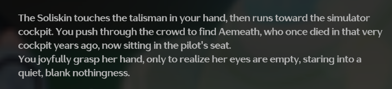 Finished the story and it's fucking KINO>huge lore drops>Aemeath was much more interesting of a character than I thought she would be>Rover development and writing that makes him feel much more human instead of just being a waifu-saving robot>great presentation in general>new weekly boss is the best bossfight in the game so farof course it's another glorified companion quest but as far as those go it's great