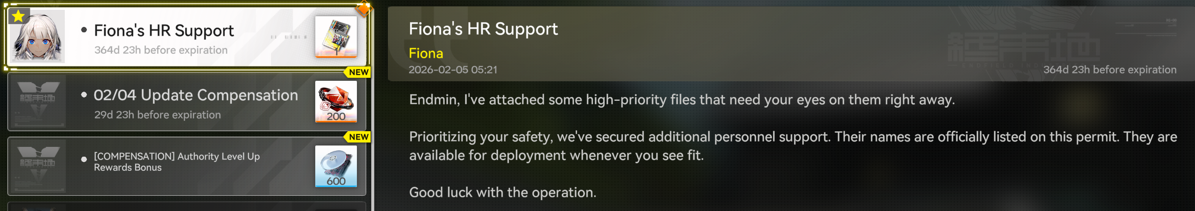 Previous thread: >>556311470>News / Dev CommsFebruary 4th - (Optimizations, balancing, and free standard 6* selector)https://endfield.gryphline.com/en-us/news/3846>Official Websitehttps://endfield.gryphline.com/en-us>Official EN X (NEWS HERE)https://x.com/AKEndfield>Chartered Headhunting ScheduleJanuary 21st to February 7th --- "Scars of the Forge", (Laevatain)February 7th to February 24th --- "The Floaty Messenger", (Gilberta)February 24th to March 13th --- "Hues of Passion", (Yvonne)>Reward CodesENDFIELDGIFTENDFIELD4PC>Twitch Dropshttps://endfield.gryphline.com/special/third-party-binding?channel=twitch>Voyage to the Stars (Ongoing until March 4th)https://endfield.gryphline.com/activity/voyage-to-the-stars/en-us/>Over the Frontier Themed Galleryhttps://endfield.gryphline.com/special/over-the-frontier>Special Launch Streamhttps://www.youtube.com/watch?v=dz2g_D52NR0 >Official Release Trailerhttps://www.youtube.com/watch?v=oJ00ggFb8A0 >Official Release PV'shttps://www.youtube.com/watch?v=5Xm45NwWOlo https://www.youtube.com/watch?v=UPpeeft1-8o https://www.youtube.com/watch?v=tN80M6IEMo0 >Wikishttps://wiki.skport.com/endfield (Official)https://perlica.moehttps://warfarin.wiki/enhttps://endfield.wiki.gg/>Blueprint Guideshttps://talospioneers.com/en>Stickershttps://drive.google.com/drive/folders/13KH3L6QPIKkVH7pBddv4uxwmwJsnOtklhttps://drive.google.com/drive/folders/1OuVtjv1k-9c3M6n7d4PX3CGG5bkwH04ahttps://drive.google.com/drive/folders/1AStB8bzFk3lSwMwczWPkFYCBrZe0vHOghttps://drive.google.com/drive/folders/1yS0lqUhxf8tBRtpDFfCU1y16IS2sSeF7>Fr/end/sSubmit your info, /end/min:https://forms.gle/Fo7BhZMKaKqiWyL19View other /end/mins:https://docs.google.com/spreadsheets/d/1YtxiDss0hgEQhLlZgpfzyGrJrzUcqDzOS9T6IH-BiVc/edit?usp=sharing