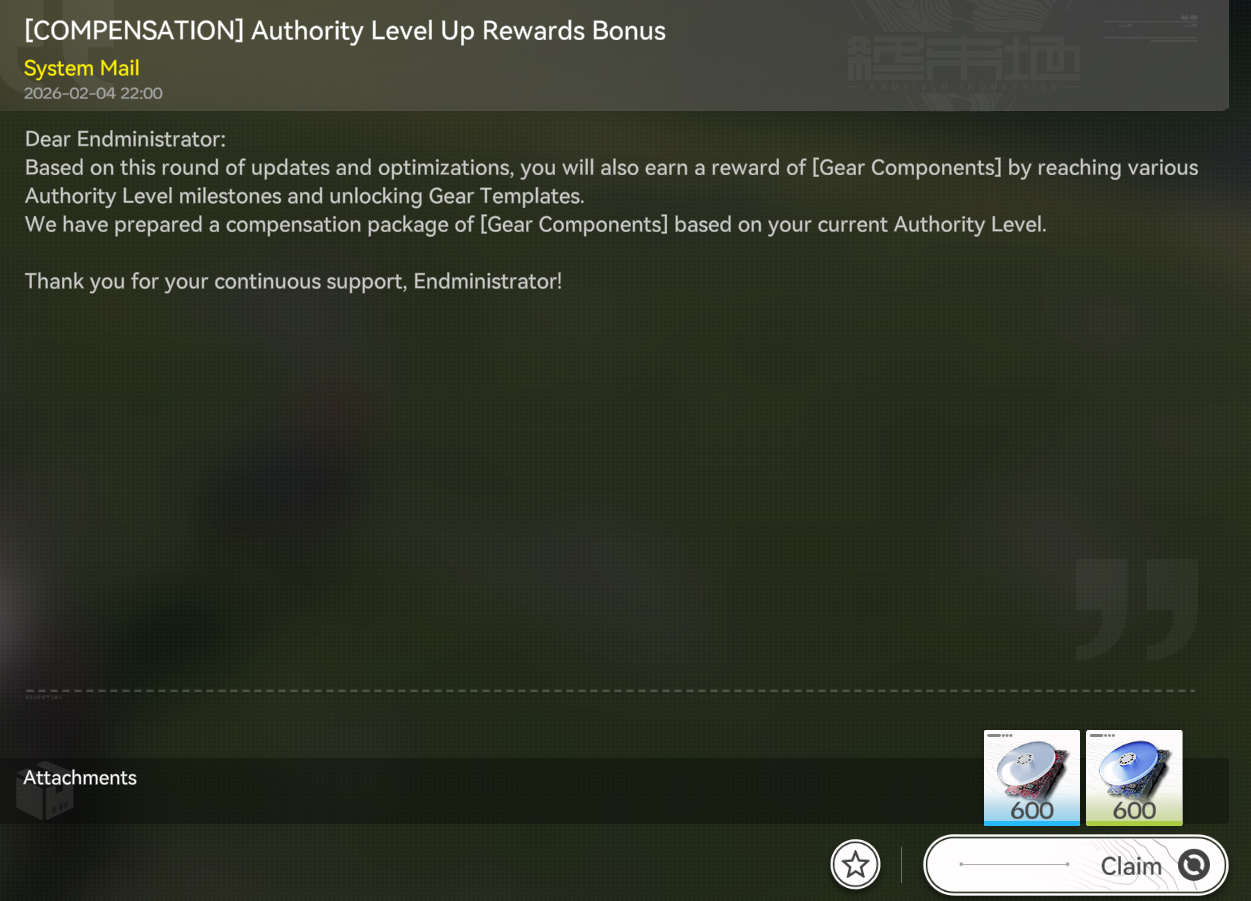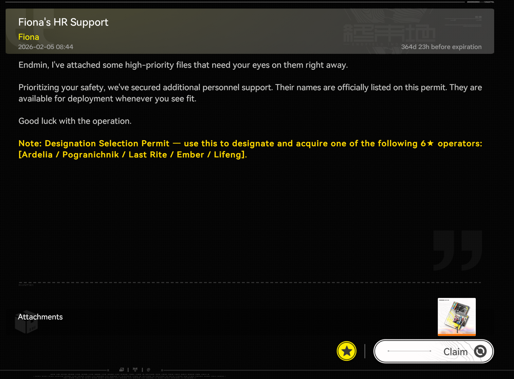 Previous thread: >>556322854>News / Dev CommsFebruary 4th - (Optimizations, balancing, and free standard 6* selector)https://endfield.gryphline.com/en-us/news/3846>Official Websitehttps://endfield.gryphline.com/en-us>Official EN X (NEWS HERE)https://x.com/AKEndfield>Chartered Headhunting ScheduleJanuary 21st to February 7th --- "Scars of the Forge", (Laevatain)February 7th to February 24th --- "The Floaty Messenger", (Gilberta)February 24th to March 13th --- "Hues of Passion", (Yvonne)>Reward CodesENDFIELDGIFTENDFIELD4PC>Twitch Dropshttps://endfield.gryphline.com/special/third-party-binding?channel=twitch>Voyage to the Stars (Ongoing until March 4th)https://endfield.gryphline.com/activity/voyage-to-the-stars/en-us/>Special Launch Streamhttps://www.youtube.com/watch?v=dz2g_D52NR0>Official Release Trailerhttps://www.youtube.com/watch?v=oJ00ggFb8A0>Official Release PV'shttps://www.youtube.com/watch?v=5Xm45NwWOlohttps://www.youtube.com/watch?v=UPpeeft1-8ohttps://www.youtube.com/watch?v=tN80M6IEMo0>Wikishttps://wiki.skport.com/endfield (Official)https://perlica.moehttps://warfarin.wiki/enhttps://endfield.wiki.gg/>Blueprint Guideshttps://talospioneers.com/en>Stickershttps://drive.google.com/drive/folders/13KH3L6QPIKkVH7pBddv4uxwmwJsnOtklhttps://drive.google.com/drive/folders/1OuVtjv1k-9c3M6n7d4PX3CGG5bkwH04ahttps://drive.google.com/drive/folders/1AStB8bzFk3lSwMwczWPkFYCBrZe0vHOghttps://drive.google.com/drive/folders/1yS0lqUhxf8tBRtpDFfCU1y16IS2sSeF7>Fr/end/sSubmit your info, /end/min:https://forms.gle/Fo7BhZMKaKqiWyL19View other /end/mins:https://docs.google.com/spreadsheets/d/1YtxiDss0hgEQhLlZgpfzyGrJrzUcqDzOS9T6IH-BiVc/edit?usp=sharing