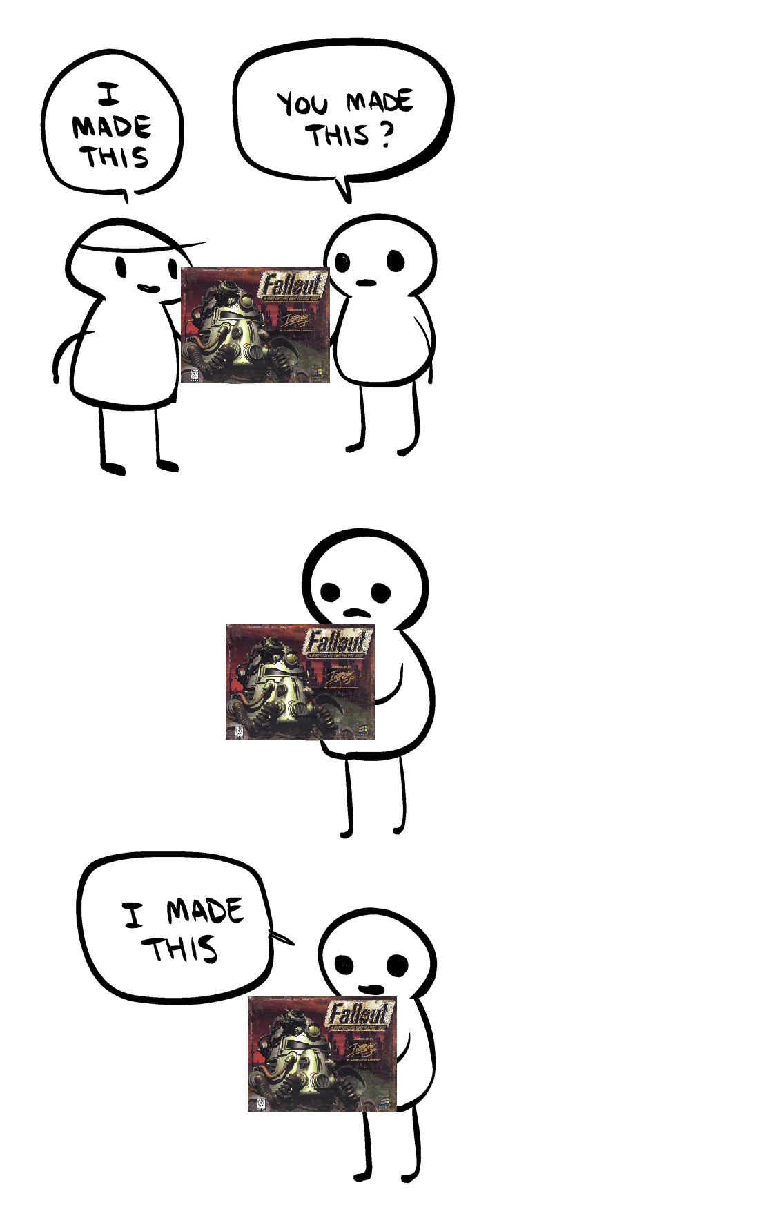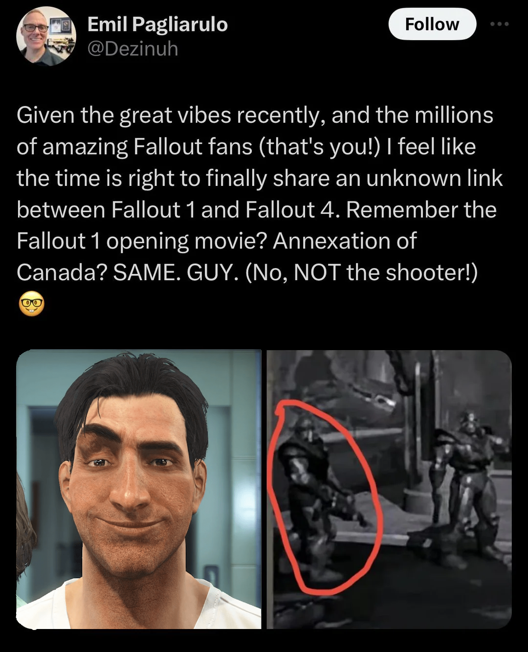 >>556538540Its a meme spawned by emil (somewhat jokingly) saying on xitter that nate was the guy from the Fallout 1 opening shooting the Canadian rebel in the back of the head.