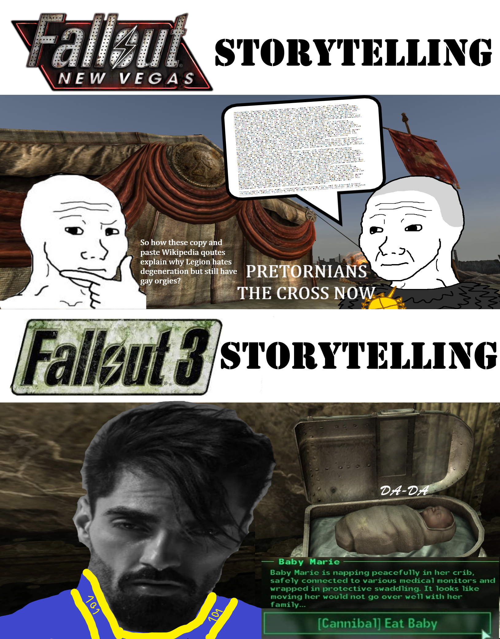 >>556352169F3 is still my favourite. Ive competed 3, nv and 4. Tried playing F1 but my eyes began to hurt from all the darknessF3 writing is just plain better than FNV. I don't care about the RPG aspect honestly, i just want to have fun. And F3 was great, it actually felt like a post apocalyptic worldI have seen numerous complaints about F3 that it feels like "the bombs dropped yesterday instead of 200 years ago, and FNV seems like proper 200 years later with society rebuilding etc".I find it a shallow critique. Why are we pretending that any of us know what a post apocalyptic world is supposed to look like? We're just playing to have fun. Random shit like city built around a bomb, a super mutant attack if you rescue a stuffed teddy from a cage etc