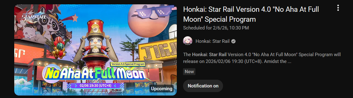 Previous: >>556360725>Version 4.0 "No Aha At Full Moon" Special Program will release on 2026/02/06 19:30 (UTC+8)https://www.youtube.com/watch?v=JwD3wN33R_Ahttps://www.youtube.com/watch?v=r2bxxcYK9qo>Download - https://hsr.hoyoverse.com/en-us/home>3.8 Preview Page - https://act.hoyoverse.com/puzzle/hkrpg/rpg_version_page_380_1327/index.html>Version 3.8 Trailer: "Memories are the Prelude to Dreams"https://www.youtube.com/watch?v=dUZl4ssk5Pwhttps://www.youtube.com/watch?v=sWuPj0W7I-I>The Dahlia Character Trailer: "The Final Note"https://www.youtube.com/watch?v=SVeam_lliG0https://www.youtube.com/watch?v=7_hmkhWGbzE>Improv Tour Trailer: "Binge It All! The Truth After the Battle of Irontomb!"https://www.youtube.com/watch?v=VsrABLcQQvchttps://www.youtube.com/watch?v=FOj68wLqj7A>Myriad Celestia Trailer: "Anti-Destruction Alliance"https://www.youtube.com/watch?v=ZwnE5o7_gzAhttps://www.youtube.com/watch?v=_2YD35PJOmU>Current Character Banners: Aglaea, Sunday + Tingyun, Yukong, Dan Heng - https://www.hoyolab.com/article/43491055>New Drip Marketing:>Yao Guang (5* Physical Elation) - https://www.hoyolab.com/article/43021359>Sparxie (5* Fire Elation) - https://www.hoyolab.com/article/43037945>Redeemable Codes - https://hsr.hoyoverse.com/giftCB2RUY7Y2P9BSTARRAILGIFT>/hsrg/ Tools & Resourceshttps://rentry.org/hsrg-resources-14>/hsrg/ Thread Templatehttps://rentry.org/hsrg-thread-template-14