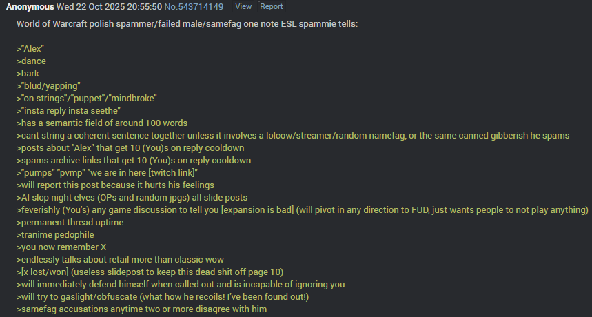 https://clips.twitch.tv/SneakyQuaintShallotArgieB8-SVEBlchz7BxvNwNTI can for sure say everything wrong with WoW started with TBC. Classic in itself was the perfect game, the content island like Outland Northrend and shit killed the game.If TBC was good anybody would still play it nobody plays TBC though. I’m just glad vanilla is universally agreed as the best game.Best part of vanilla (And WoW) by far. 1-60, Ony, MC, BWL are trve inspired pieces made by the original team. Everything after is just a retcon abomination. Let's not even get started on TBC or Wrath of the (Retoilet) Lite King.TBC was cucked from the start with the jew Tigole: resilience, cucking world PVP, nerfs to CCs, giving everyone a ranged interrupt, stat bloating, etc. ruined the game. In addition to all the lore rape that occurredVanilla was the only time the game was good. Everything after it was a slowing of growth and utter stagnation leading to decline. The only reason tbc and wotlk are seen as positive is because of the momentum from Vanilla lasting into their timelines. Those expansions did nothing to grow the game on their own.TBC sucked dick, and every single expansion beyond it just copy/pasted tiny variations of the same shit, over and over. Once factions shared a city it was over. Blizzard knew they could do half the work for the same engagement/sub numbers and mailed everything in. It's also when the leadership at the company took a backseat and started counting money and letting the interns run the show and turn the wrenches.