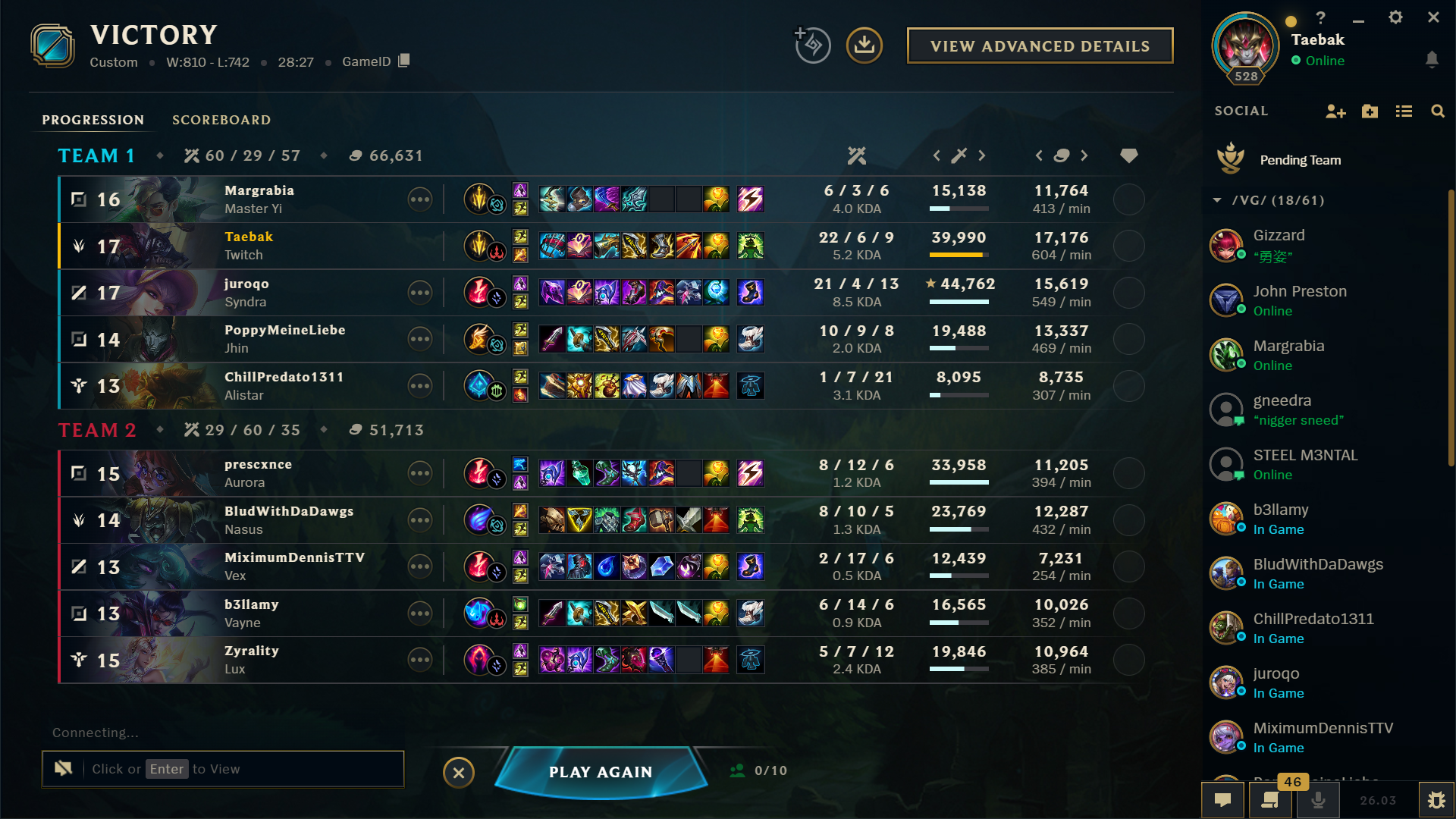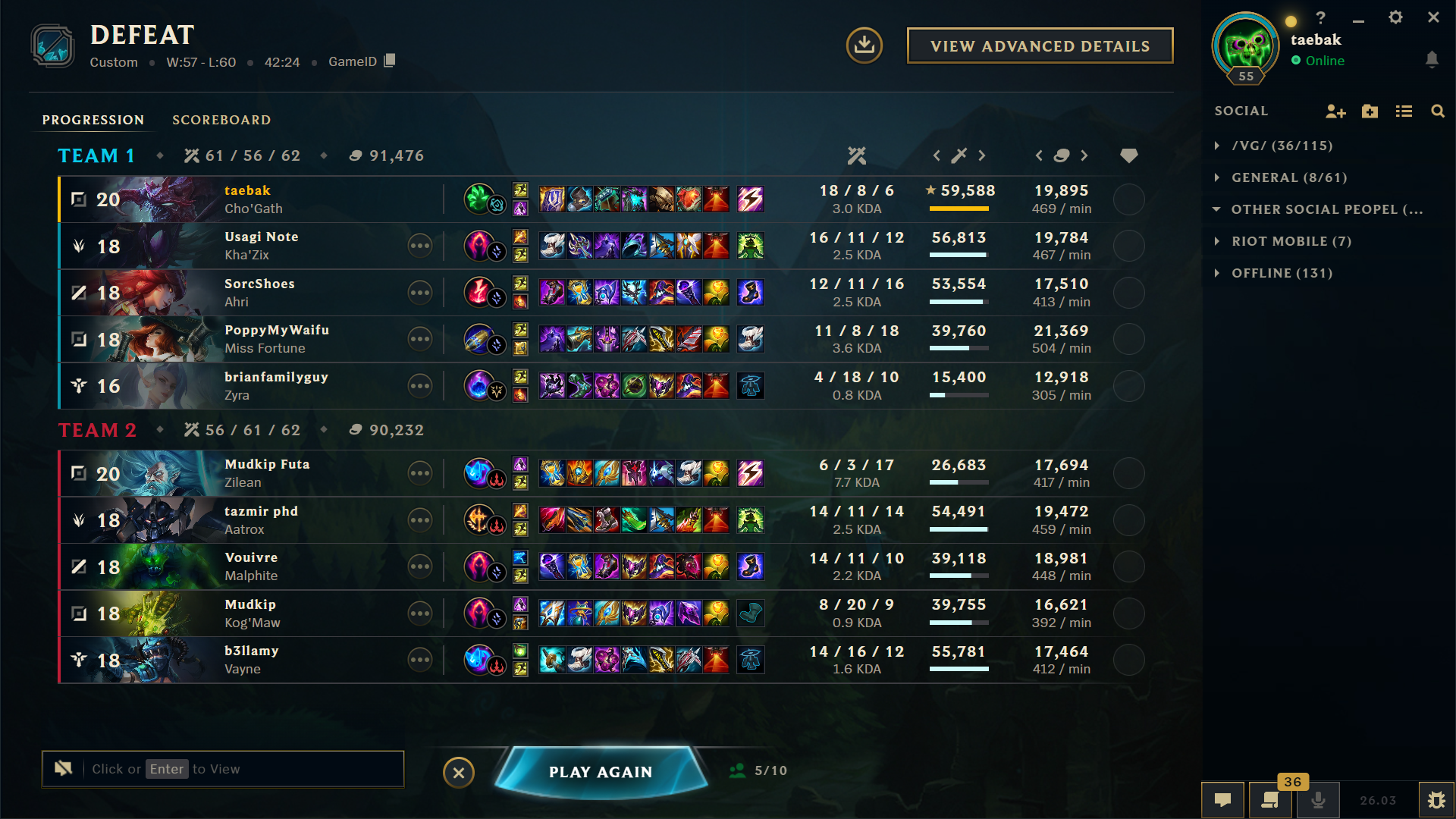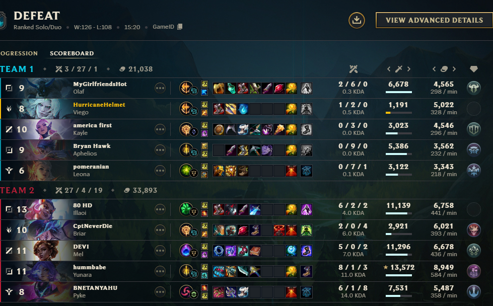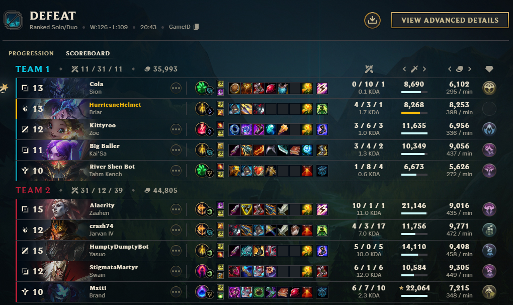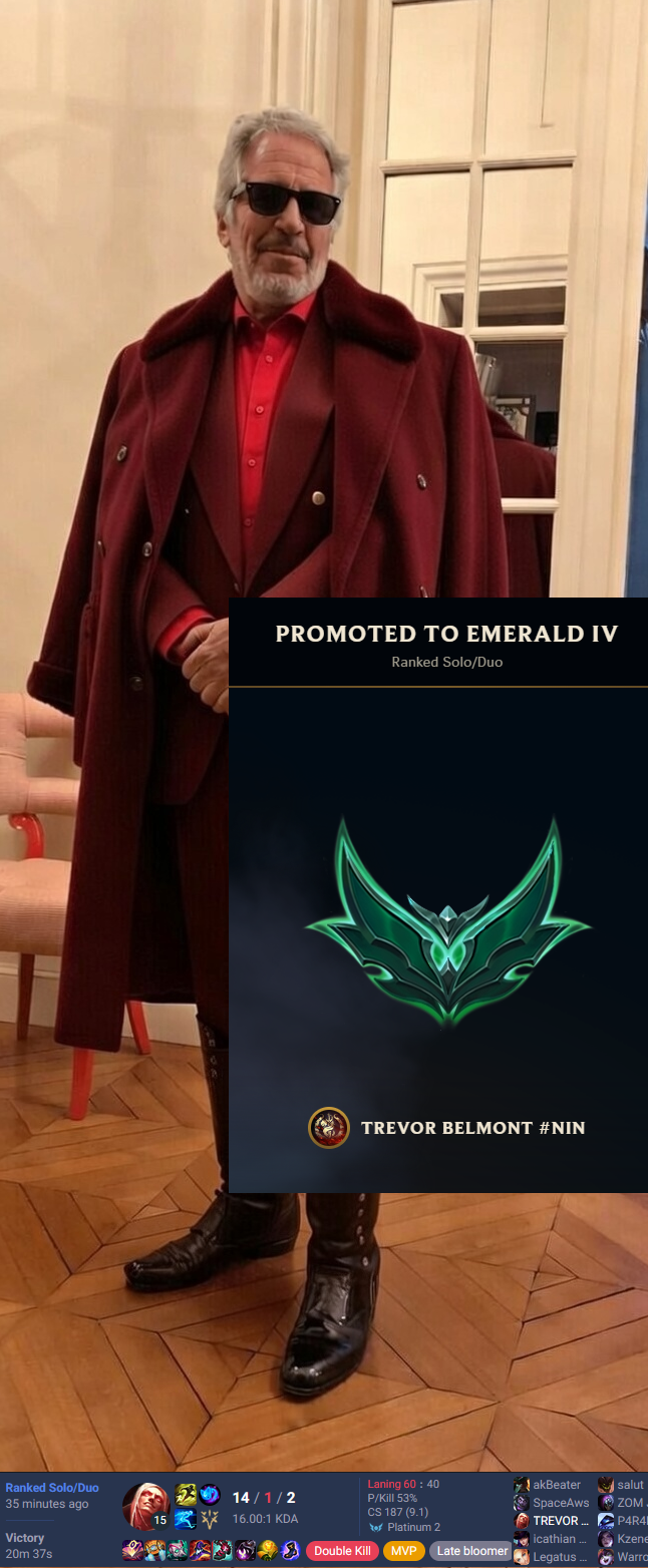 Actual lowest quality games tonight, thank God I didn't queue ranked. >yuumi jungle>0/12 belvethAnd this last one shouldn't have even been a win. Jinx and I were the only ones fed and we had a crit Darius. I completely lost focus too because I kept thinking of Briar wearing elastic waistband jeans with those dumb little cars crocs and it was making me laugh and make really retarded plays.