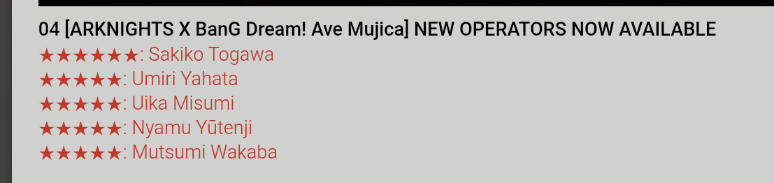 Previous thread: >>556353356Happy birthday to Mint![2/6]CNY Stream 19:30 UTC+8: https://live.bilibili.com/5555734>CURRENT, FUTURE GLOBAL/JP/KR CONTENT:[1/30-2/13][Standard]6* Vanguard Vulpisfoglia, 6* Caster Goldenglow (Shop), 5* Caster Tecno, 5* Vanguard Surfer, 5* Defender Firewhistle (Shop)[1/16-2/6]Ato - 5* Vanguard Matsukiri[1/16-2/13][Marthe, Coral Coast & Misaligned Sightseer]Thorns the Lodestar, Ch'en the Holungday, Necrass, May, Pepepipi[1/23-2/6]CC2#4: Arclight - Aciddrop Skin[1/23-2/6][Joint Operation]6* Guard Entelechia, 6* Caster Necrass, 6* Caster Nymph, 6* Guard Qiubai, 5* Supporter Alanna, 5* Caster Aroma, 5* Supporter Windflit, 5* Medic Paprika, 5* Guard Gracebearer, 5* Medic Vendela[2/3-2/17]Duel Channel: Honeydew[2/3]Holographic Combat Matrix>CURRENT, FUTURE CN CONTENT:[1/29-2/12][Standard]6* Caster Blaze the Igniting Spark, 6* Vanguard Ines (Shop), 5* Medic Paprika, 5* Medic Nowell, 5* Specialist Spuria (Shop)[1/16-2/6][Crossover]Rosa, Ifrit[1/27-2/10]Such is the Joy of Our Reunion Rerun - Xingzhu & Wan Qing skin[2/3-3/3]Reselling a bunch of skins>/akg/ website:akgcc.github.io>AK EN Database:puppiizsunniiz.github.io/AN-EN-Tags/akhrchars.html>More valuable resources:rentry.org/akg_resources>/akg/ merch guiderentry.co/akg_merch