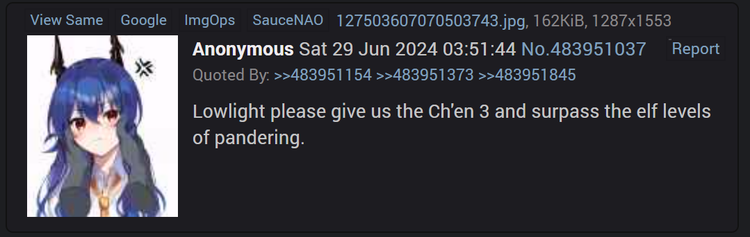 >>556468821There's a risk that a 2nd alt, especially from Ch'en of all people will cause controversy. By making her standard HG is playing it safe. People tend to consider the limited the main prize and may let it slide even if they don't like the standard. Also avoid triggering Suifags