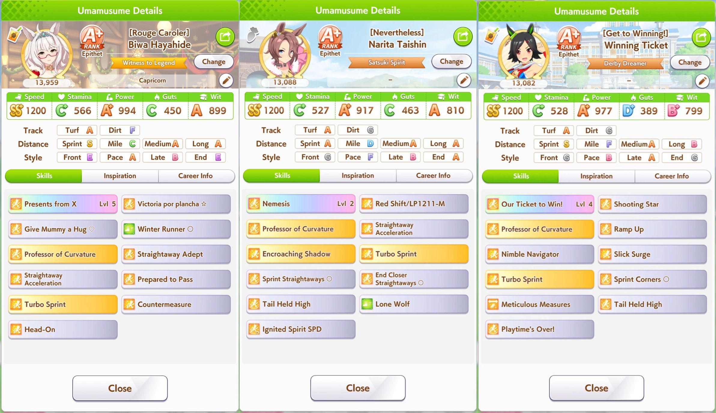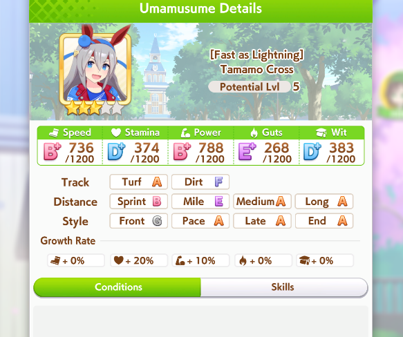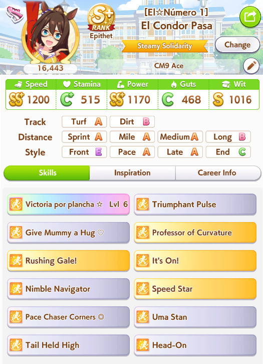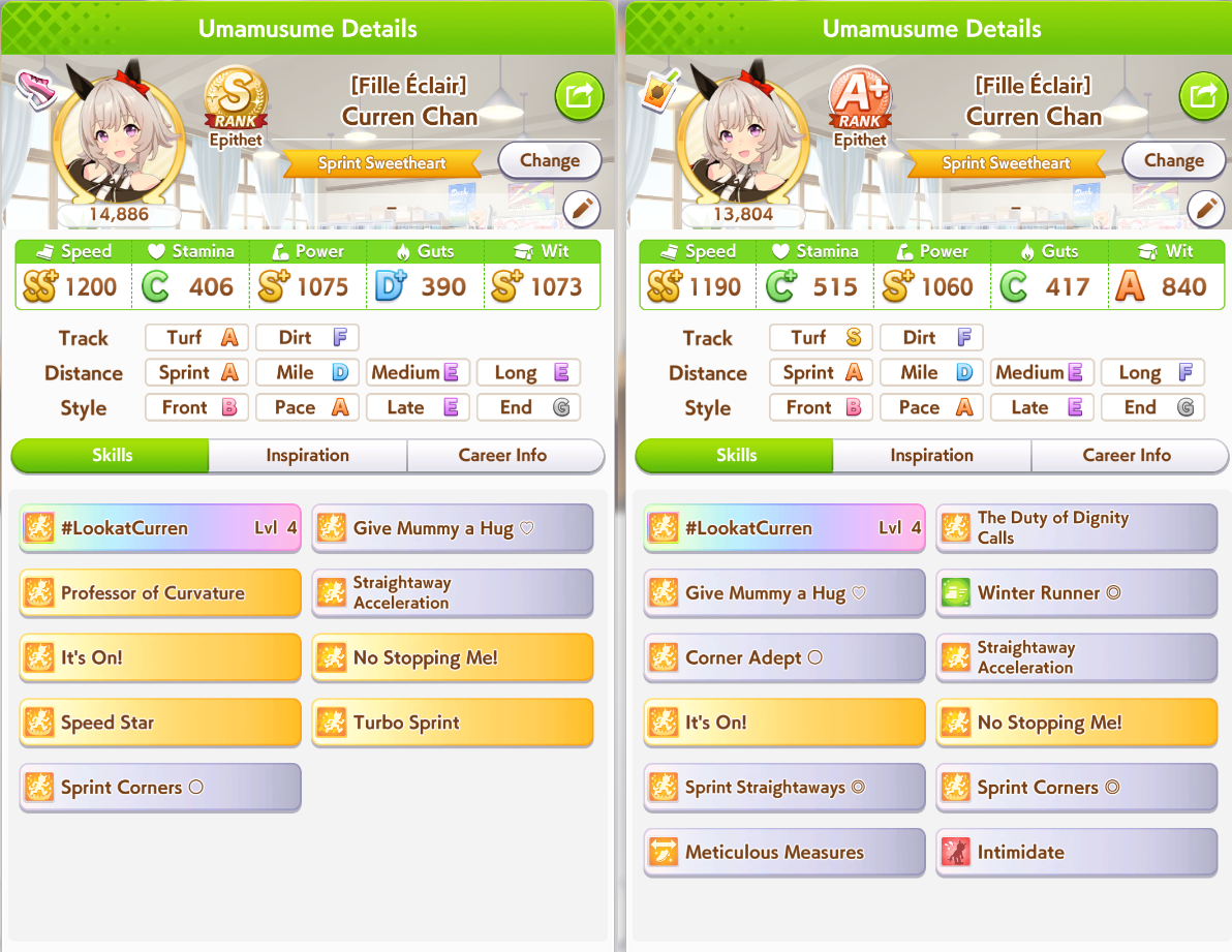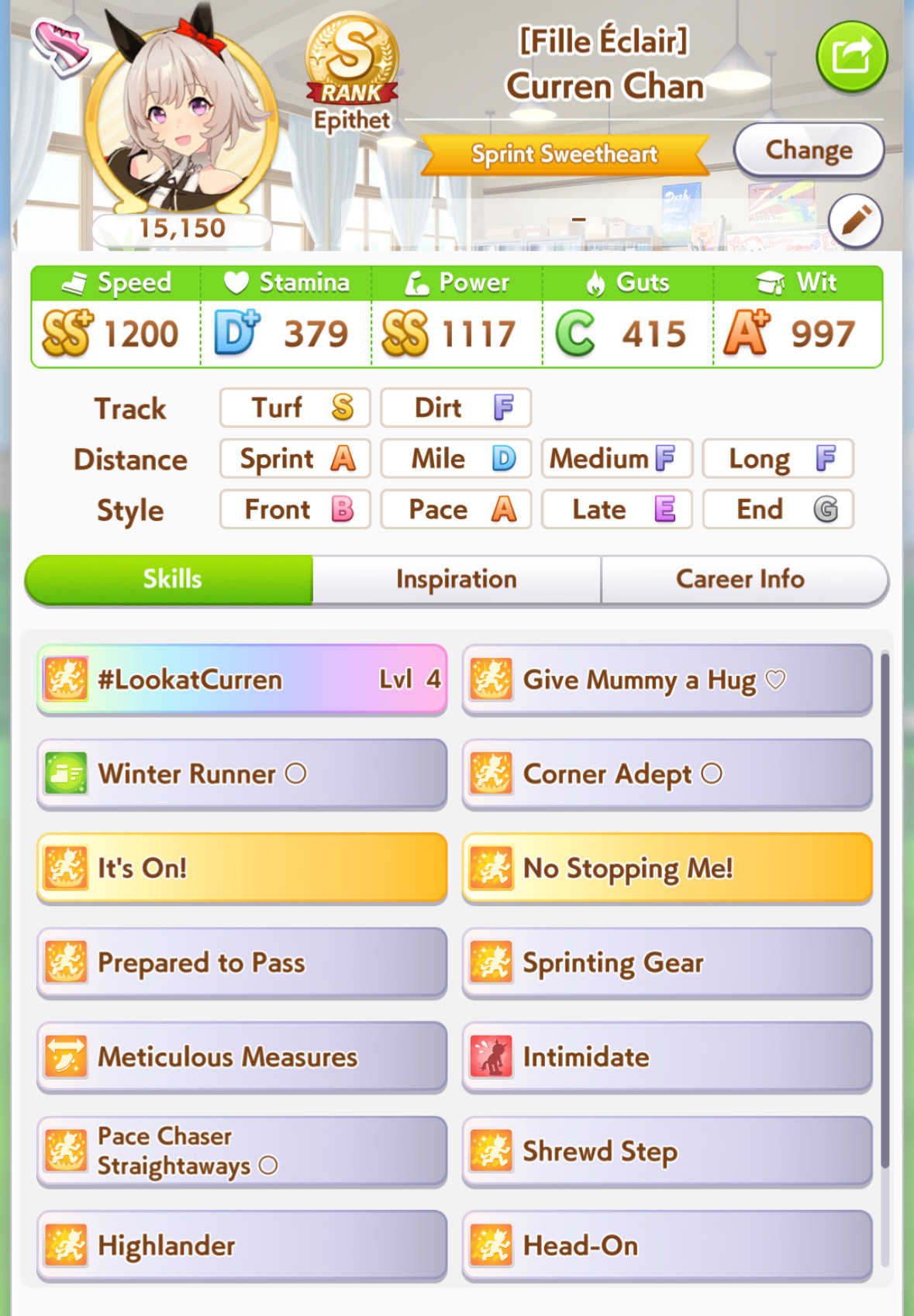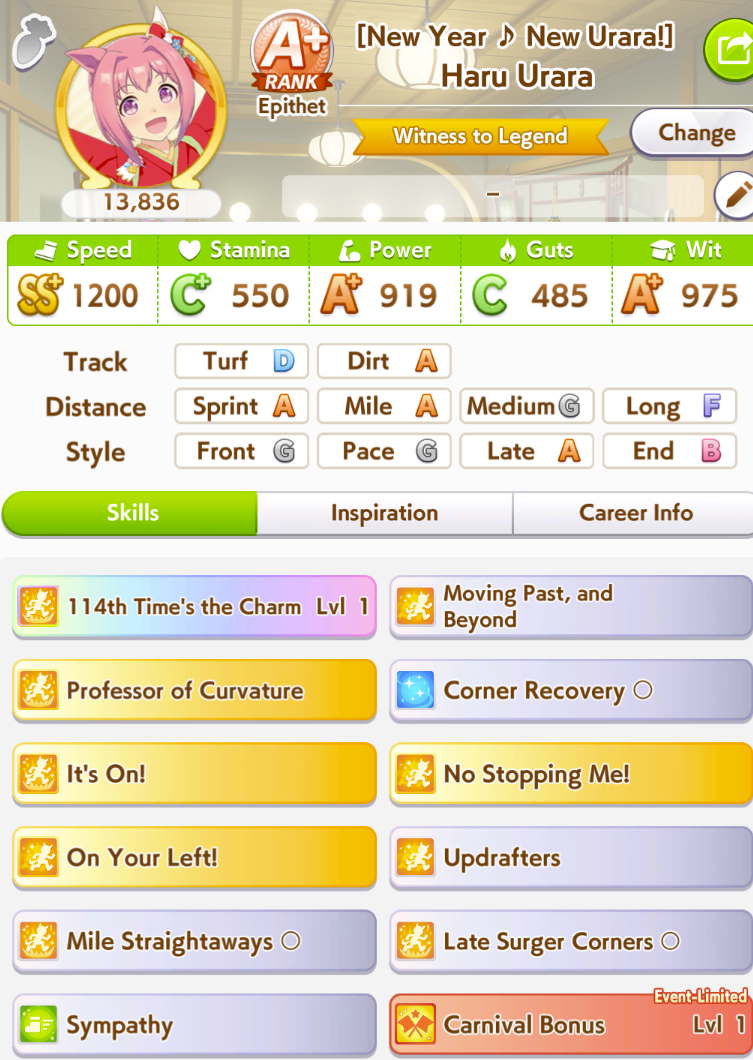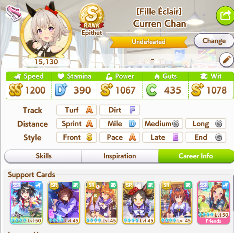 ok I'm not getting better luck than this. First time ever capping two stats, and definitely when a third is over 1k. Thank FUCK the sprint sparks proc'd senior inspo, but of course my skills low-rolled>no head on>no straight descent>no pace chaser cornersoh well. I think this will easily win me B finals.
