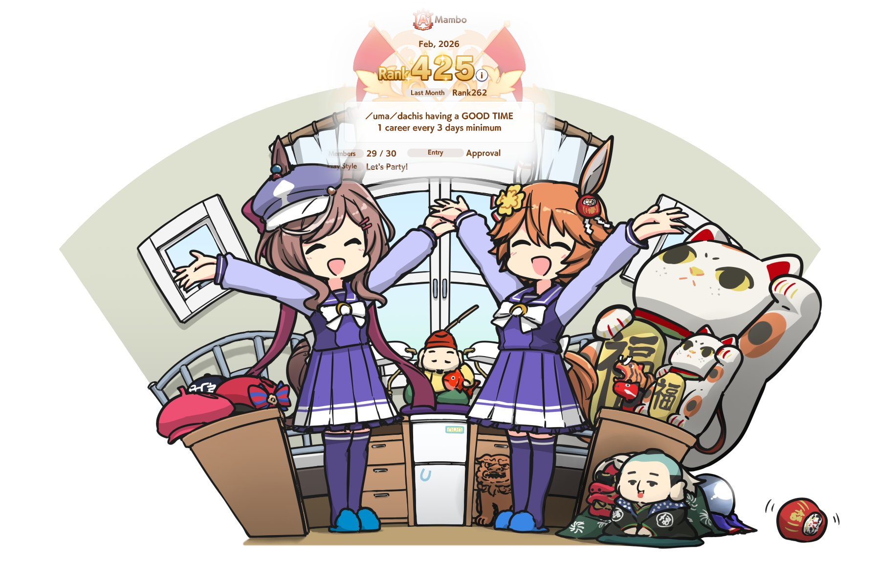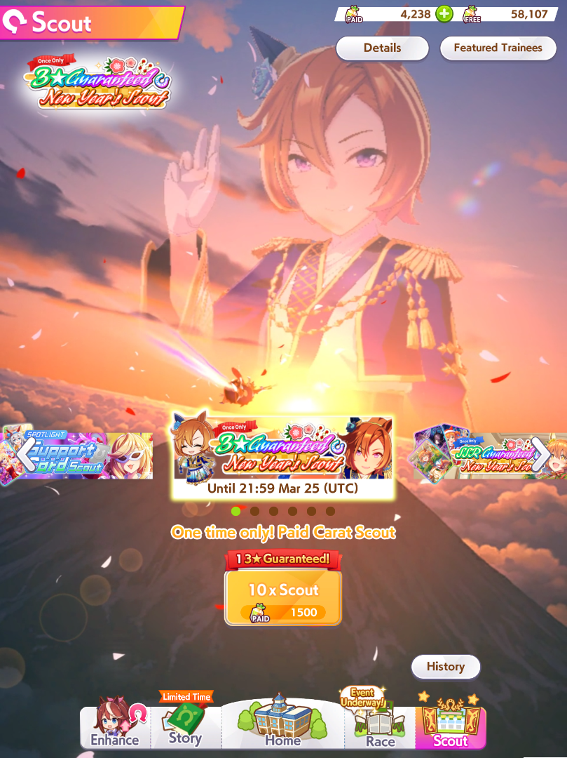 Previous: >>556423748>Global Game NewsLink your account to Cygames iDCurrent Scenario: Aoharu Hai aka "Unity Cup"Current Rate Up Trainee: New Year T.M. Opera O (3*), New Year Haru Urara (3*)Current Rate Up Support Cards: SSR Admire Vega (Power), SSR Matikanefukukitaru (Speed)Current CM: Capricorn Cup - Chukyo Turf 1200mMain Story Chapter 5 is out01/27 - New Beginnings Part 101/29 - NY Opera & Haru 3*+Fuku SSR+Ayabe SSR02/05 - 02/12 Racing CarnivalMid February - Capricorn Cup - Chukyo Turf 1200mhttps://umamusume.com/news/100040/https://pages.snep.pw/uma/anni-skill-changes/>JP Game NewsCurrent Rate Up: Valentine Taiki Shuttle (3*), Valentine Sounds of Earth (3*), SSR Matikanefukukitaru, SSR Neo UniverseNew Scenario "Yukoma Hot Spring" releasedTimeline: https://uma.moe/timelineCygames Webstore: https://webstore.cygames.com/en/umamusume_en/>Thread Clubshttps://rentry.co/umaglobalclublistYou must be E3 (20k points) to join a circle. Apply with /uma/ or /vg/ in your profile or post ID in the thread.>All Guides & Resourceshttps://rentry.org/uma26Game databasehttps://gametora.com/umamusume (Click the gear to switch between JP / global server info)A basic guide for newfagshttps://rentry.org/umaglobalFind networks if your region is blocked from the game or clienthttps://www.umavpn.top/93Seiyuu & Concertshttps://rentry.org/umstUma Texthttps://umareader.idsmile.xyz/