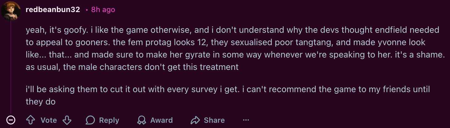 Is it just me or is Endfield quite horny?Game DiscussionDon't get me wrong. Surely there are games out there with much more revealing designs. But it's now the third time that I met a new female character in this game and got a close-up on her detailed butt without asking and without any reason in the first few seconds of meeting her. I learned the name of this NPC after the close-up.Don't get me wrong, I have nothing against fan service and i not mind revealing outfits. But this still feels awkward. Because it feels so forced and not in a funny/self-aware way but in an unnecessary goony way.Maybe it's just me. But I think this kind of "horny" is not very appealing, but just makes me care less about a character.