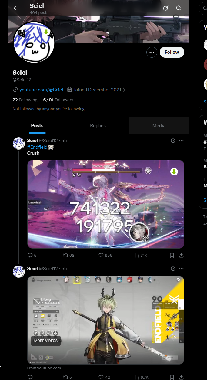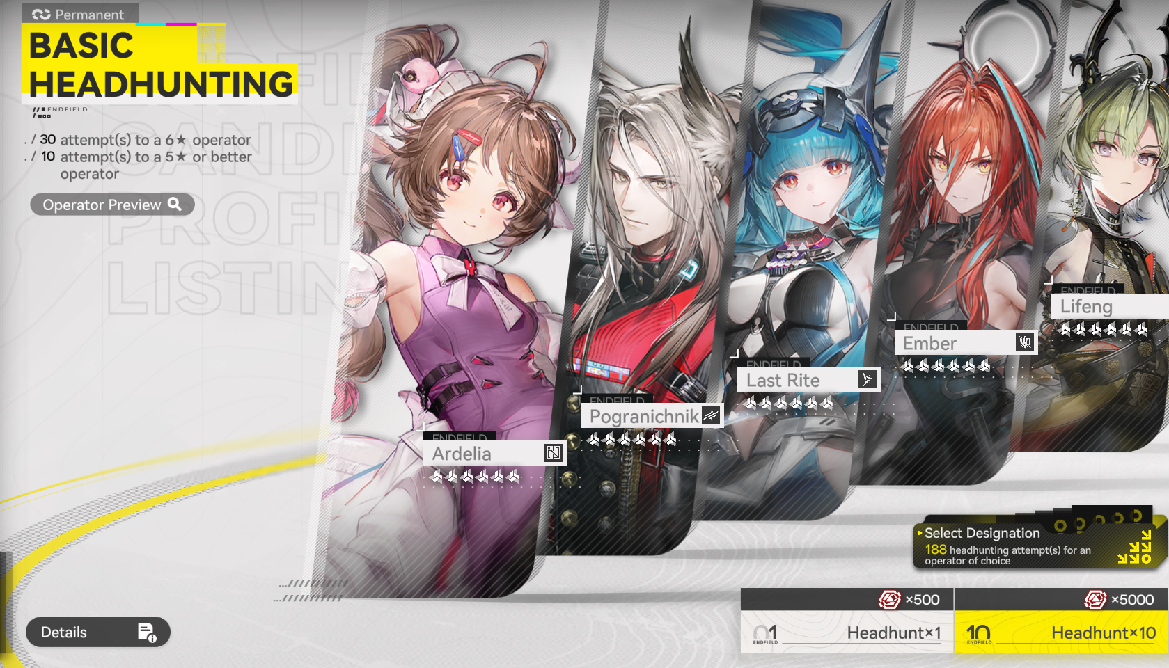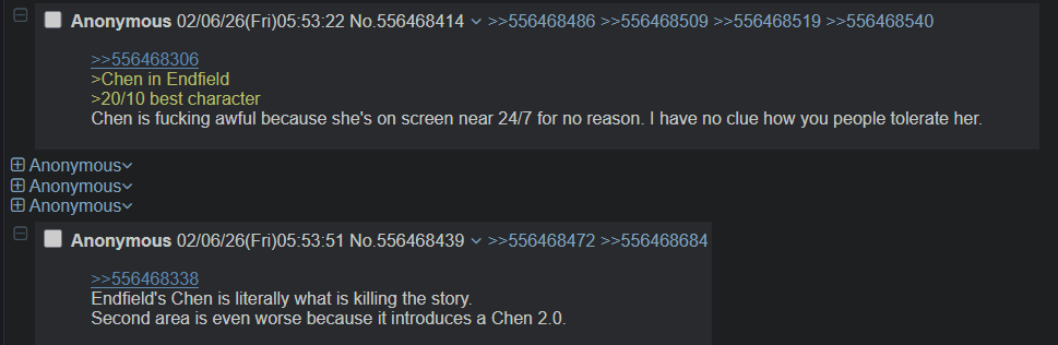 Previous thread: >>556449784>News / Dev CommsFebruary 4th - (Optimizations, balancing, and free standard 6* selector)https://endfield.gryphline.com/en-us/news/3846>Official Websitehttps://endfield.gryphline.com/en-us>Official EN X (NEWS HERE)https://x.com/AKEndfield>Chartered Headhunting ScheduleJanuary 21st to February 7th --- "Scars of the Forge", (Laevatain)February 7th to February 24th --- "The Floaty Messenger", (Gilberta)February 24th to March 13th --- "Hues of Passion", (Yvonne)>Reward CodesENDFIELDGIFTENDFIELD4PC>Twitch Dropshttps://endfield.gryphline.com/special/third-party-binding?channel=twitch>Voyage to the Stars (Ongoing until March 4th)https://endfield.gryphline.com/activity/voyage-to-the-stars/en-us/>Special Launch Streamhttps://www.youtube.com/watch?v=dz2g_D52NR0>Official Release Trailerhttps://www.youtube.com/watch?v=oJ00ggFb8A0>Official Release PV'shttps://www.youtube.com/watch?v=5Xm45NwWOlohttps://www.youtube.com/watch?v=UPpeeft1-8ohttps://www.youtube.com/watch?v=tN80M6IEMo0>Wikishttps://wiki.skport.com/endfield (Official)https://perlica.moehttps://warfarin.wiki/enhttps://endfield.wiki.gg/>Blueprint Guideshttps://talospioneers.com/en>Stickershttps://drive.google.com/drive/folders/13KH3L6QPIKkVH7pBddv4uxwmwJsnOtklhttps://drive.google.com/drive/folders/1OuVtjv1k-9c3M6n7d4PX3CGG5bkwH04ahttps://drive.google.com/drive/folders/1AStB8bzFk3lSwMwczWPkFYCBrZe0vHOghttps://drive.google.com/drive/folders/1yS0lqUhxf8tBRtpDFfCU1y16IS2sSeF7>Fr/end/sSubmit your info, /end/min:https://forms.gle/Fo7BhZMKaKqiWyL19View other /end/mins:https://docs.google.com/spreadsheets/d/1YtxiDss0hgEQhLlZgpfzyGrJrzUcqDzOS9T6IH-BiVc/edit?usp=sharing