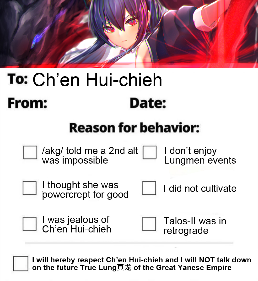 Imagine actually not liking Ch'en.I sure hope all the Ch'en hate in this general is just funny Swireposting and not actually unironic faggots who dislike the second main heroine of the game.