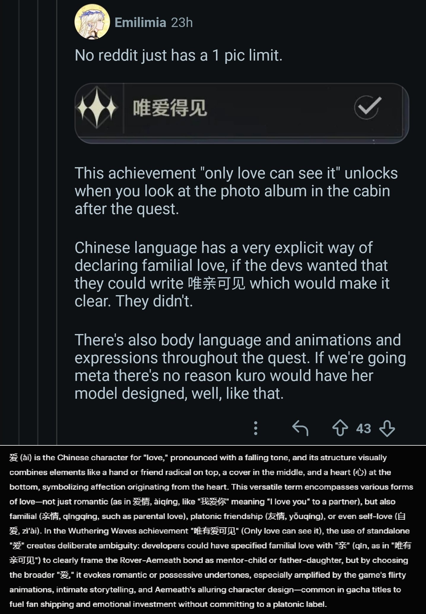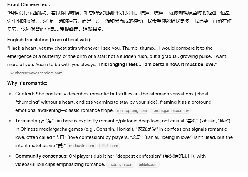 Some interesting information : In CN, the term used in the achievement "Only love can see it" for Aemeath deliberately doesn't use the chinese word for platonic/familial affection. It uses the one primarly used in a romantic context.