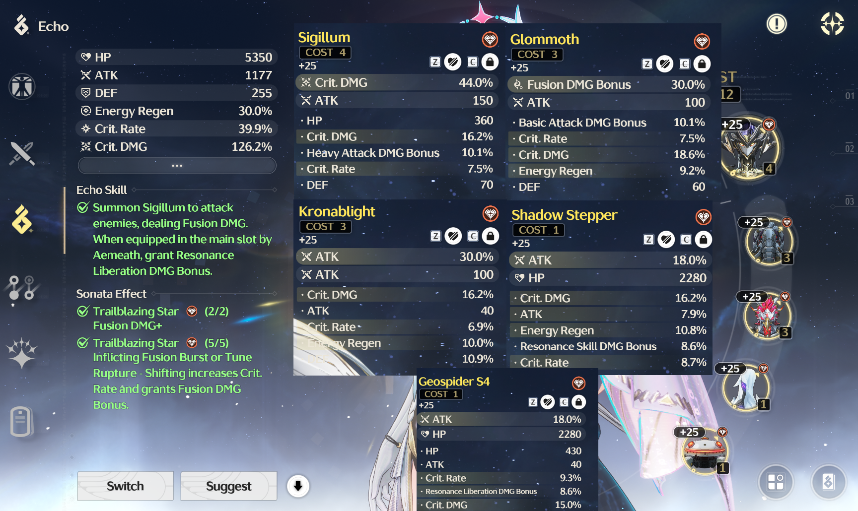 >>556529838The "suggest" button is mostly good but it has some duds. Earlier today I noticed it only suggests Sierra Gale (DPS set) on Yangyang and doesn't even mention Moonlit Clouds (subdps set). When in doubt, ask here.>What kind of Echo's should I be looking for?Ones that buff the character's damage type. Amy does fusion liberation damage. You probably don't have access to her BiS echo set yet (Trailblazing Star, accessible in the 3.1 region), so you can use Molten Rift in the meantime since it buffs fusion damage.