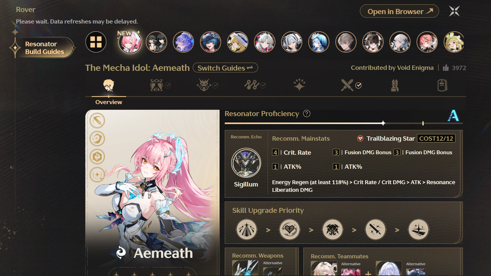>>556529838If you're a new player go to the "Guide Depot" button in the pause menu all the way at the bottom on the second page. It's extremely solid in terms of recommendations because it's community driven and is integrated into the game to show you your own character's progress with it.You can also use the "Overview" page and click the "Ascension Planner" at the top if you want a really basic idea of what you should be going for. That page is better for just knowing how many mats you need via the "Complete Plan" button.Keep in mind that until you reach level 70 you can just equip literally anything unupgraded and you're fine as long as you get the set bonus. Your character levels, weapon levels, and skill levels are way more important to care about. Once you reach 70 and can get gold tier Echoes it's far more worth it to start investing into them, but even then the game doesn't really heavily start pushing it until 80, 70 is when it nudges you to do it.