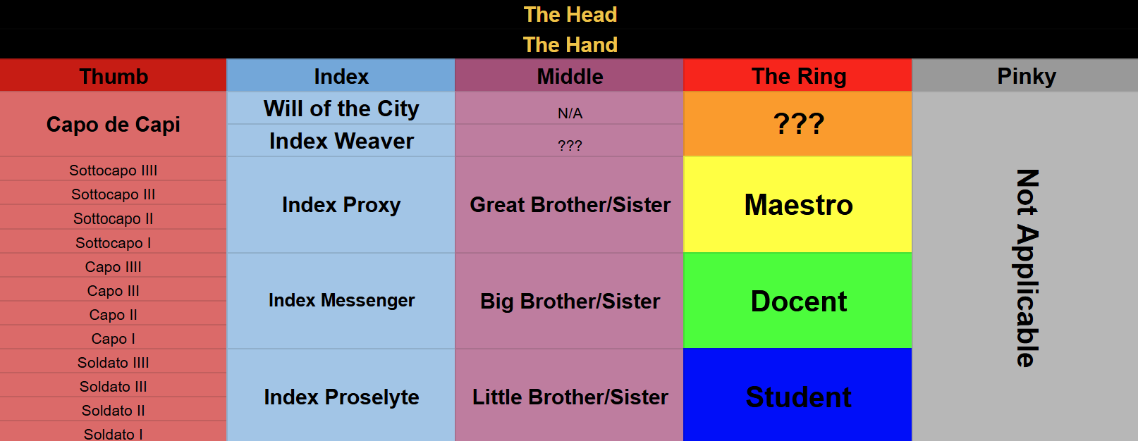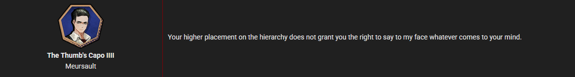 While we're talking about the thumb hierarchy...Taking Kalo's page at face value, even a shitter in section 6 of, say, Zwei West is considered to be in the same hierarchy tier as a Capo, while a giga nigga like Reynaud would be equivalent to a Soldato.Please make that make sense.