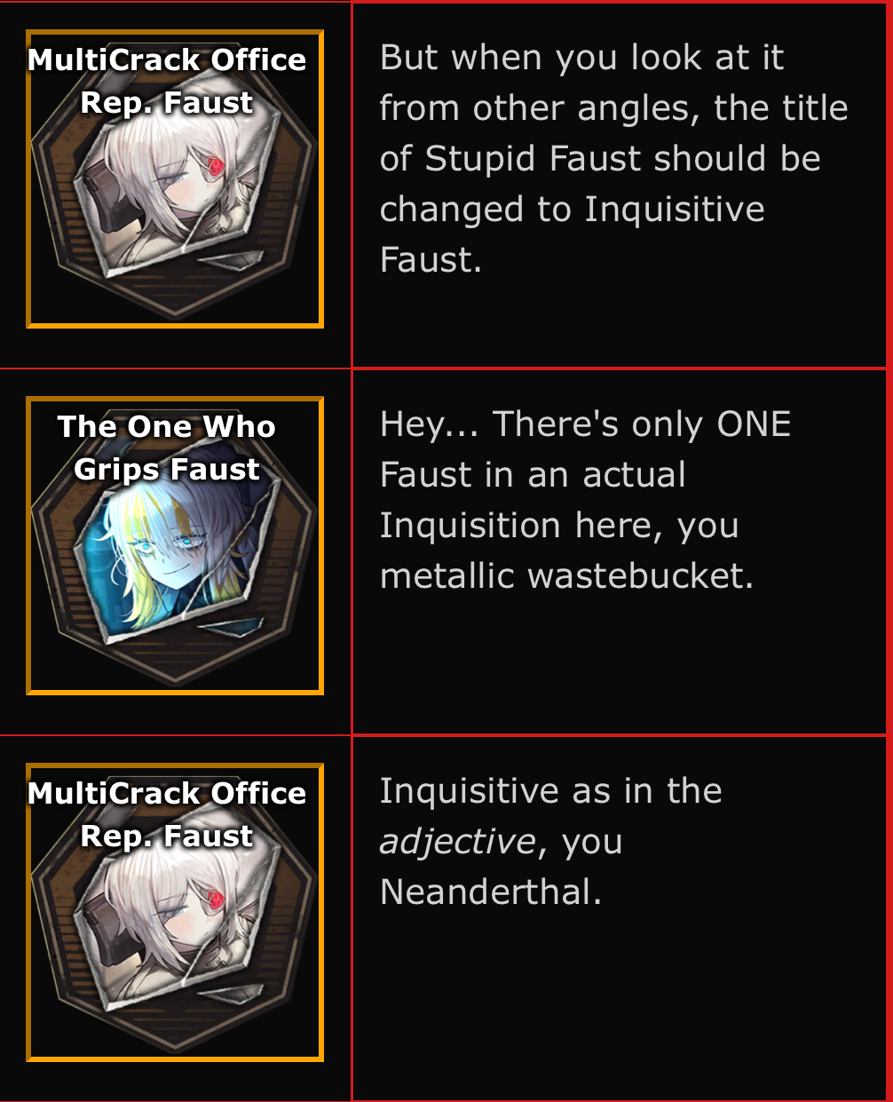 why does Stupid Faust only have one adjective?is she not even smart enough to deserve a better description?will she ever learn even a little bit of knowledge?is she cursed to forever be the stupidest and most dumbest Faust of them all?