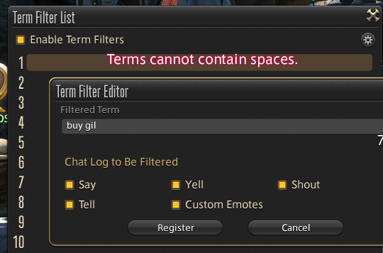 >try to use term filter list>entries can't include spacesWhat a worthless tool