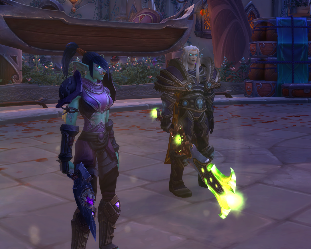Surprised they never bothered updating Koltira's sword for his Death Knightness to be blue... or red since he's a BDK.Like its a fitting design for him, its just a bit odd watching a Death Knight run around with a noticably Fel infused blade. Even if he is from the time of Blood Elves getting high on demon spunk.Could've made him a fun hybrid of Unholy Fel...