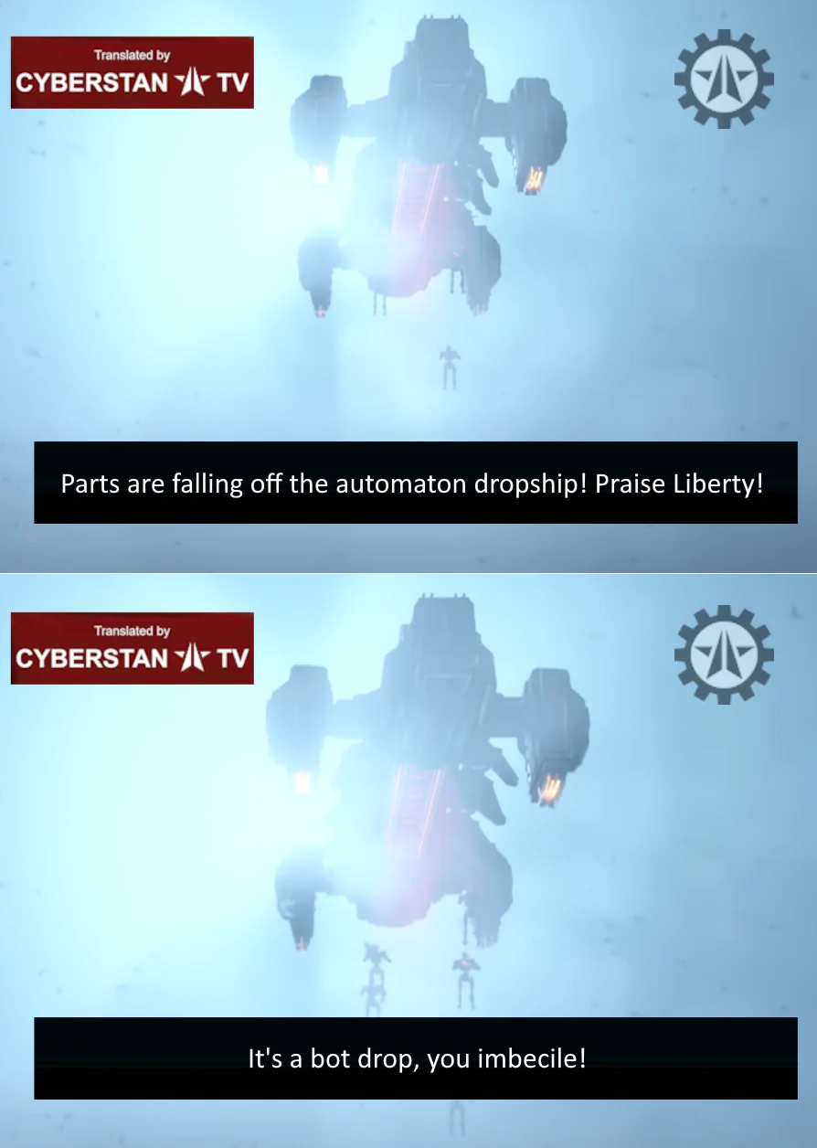 >>556592675Why does arrowhead want us to feel bad for the commie robots that decorate themeselves with human skulls?