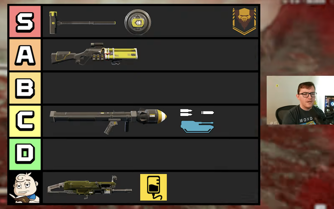 >>556622191breakhammer belongs in b or c. By his own logic for putting the leveler in c. Grenade launcher is c or high d. everything else is fine. fuck youtubers.